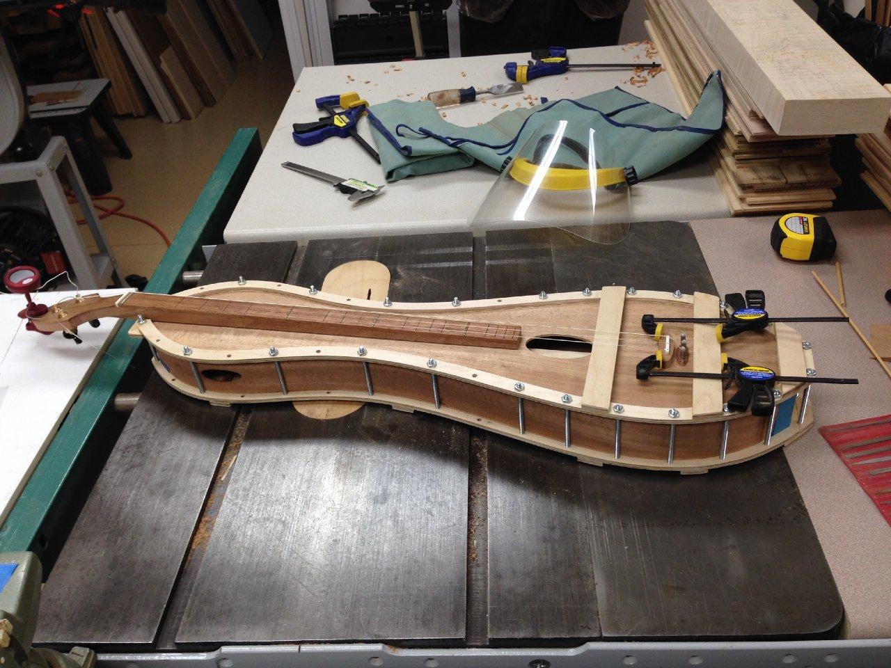 In chasing the sound of guitar family instruments, it seemed appropriate to taper the sound chest as is typical on those instruments. There is a slight taper so that the height of the rib is less at the head than the foot. The profile of the nylon string instrument is the same as my other dulcimers and it is built in the same mold.