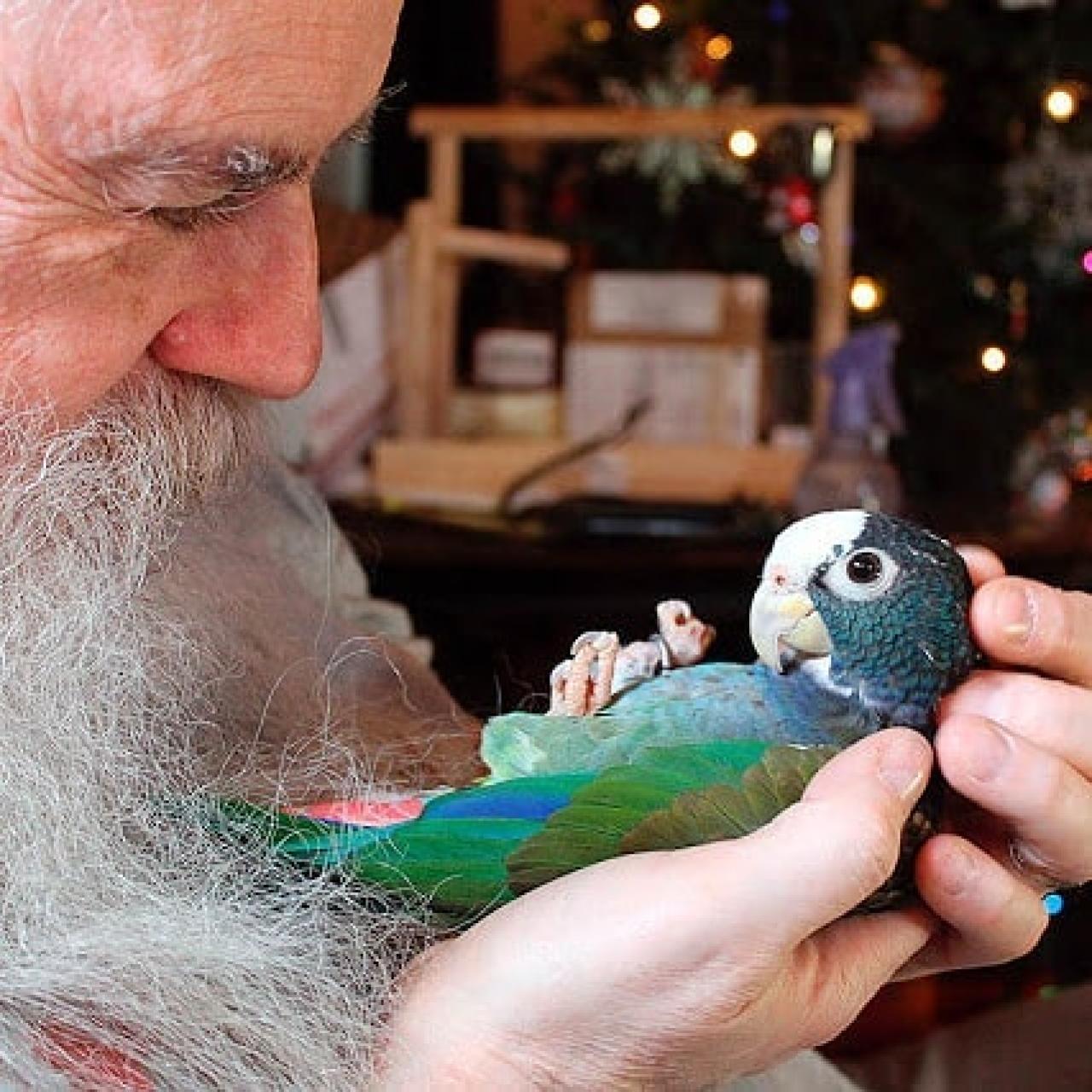 @Cyndy-j: Lol! That little fellow's name is 'Cooper'. He is a rescue. Until someone contacted me and asked whether I would be willing to foster him, I had no idea what a Pionus was. He has been here for several years now and has wormed his way into the family and into our hearts. He is a little hoople, and sometimes he can be cantankerous and curmudgeonly (Like the other guy in the photo!), like when we stepped up, twisted his head to look down at my hand, said "Ouch!" and then BIT me!! :)