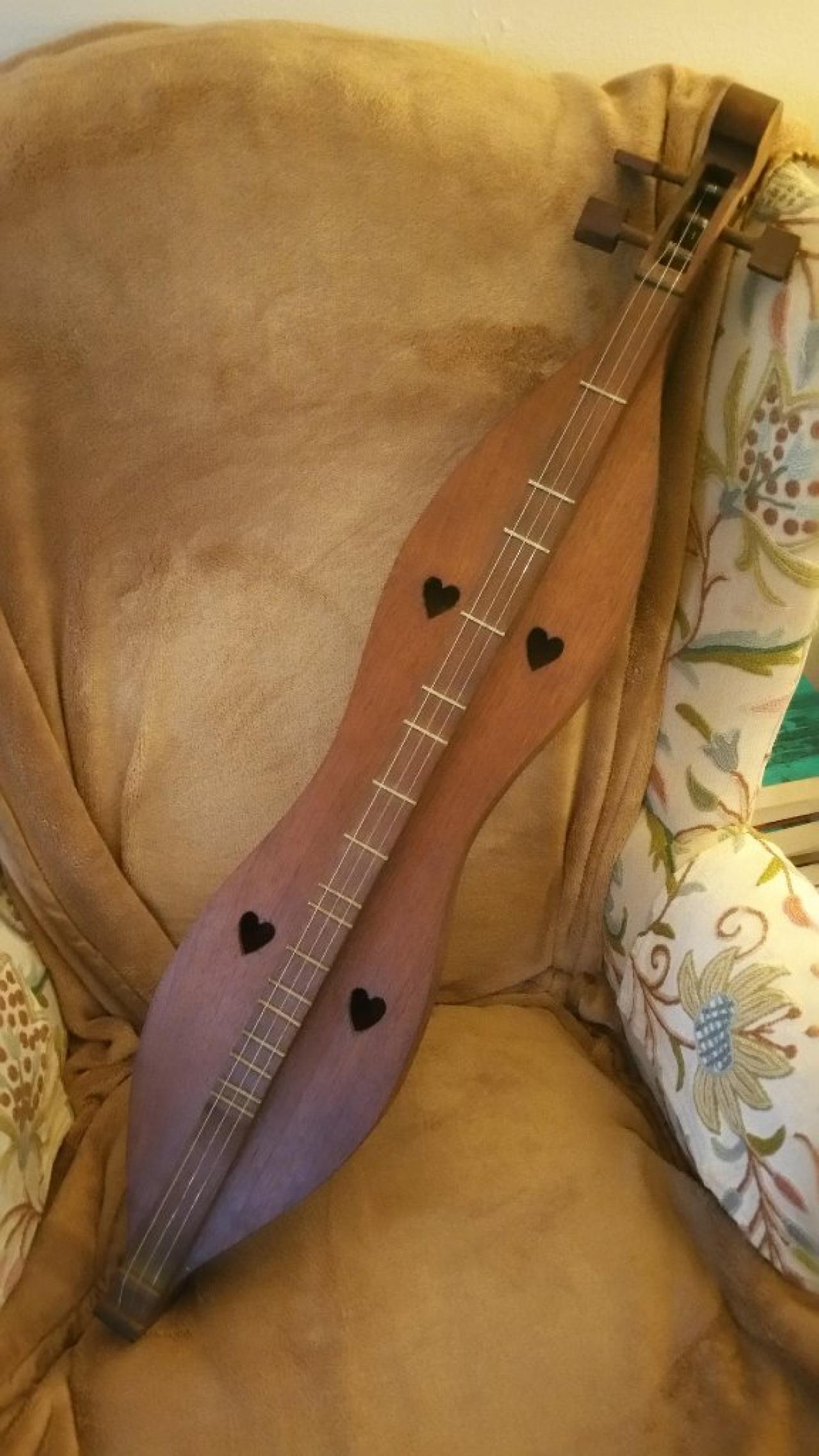 Whether because the previous owner was left handed or because the violin shop didn't know any better, it appears to be strung upside down. The wooden peg for the base string looks like it might have a tendency to slip a tiny bit if I'm not careful to seat it well, and I also suspect that the dulcimer's action may be considered high (I am clueless, but did the nickel/dime test).