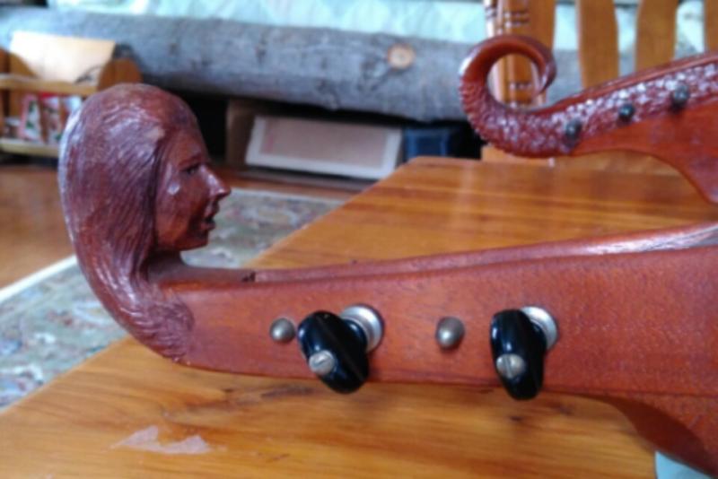 Mixed maple/walnut construction makes for a pretty, light sounding instrument, emphasizing the higher overtones but with clean mid and bass. Easy action, suitable for all abilities, which could take slightly heavier treble strings to improve the tonal balance further. Could also take geared modern tuners, but it looks so pretty as it is.
