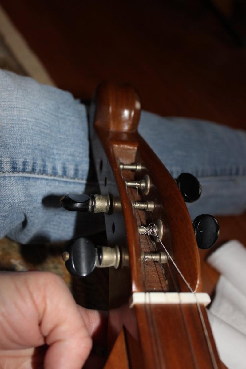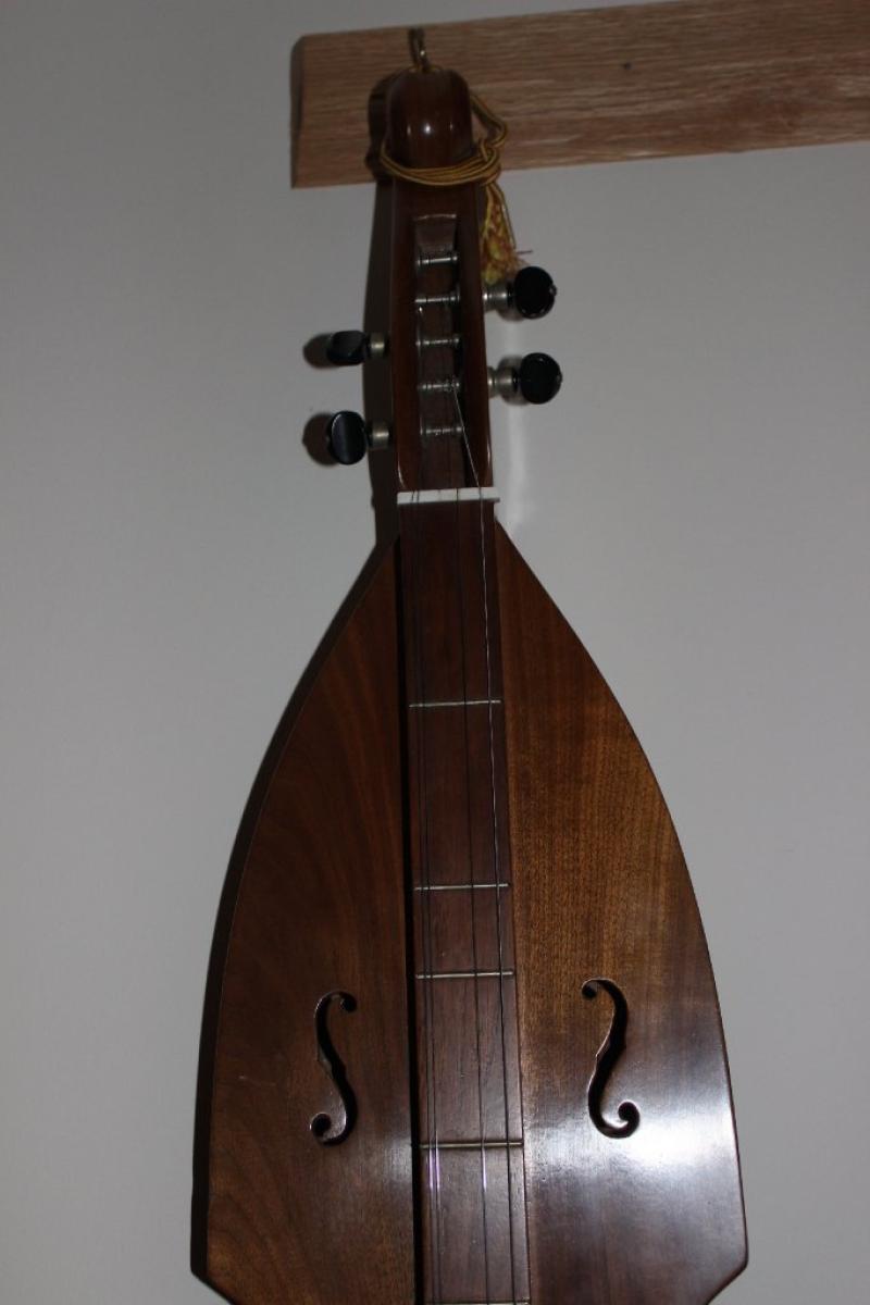 Frazier is/was a small scale maker who started in the early 70s and was producing no more than 20 instruments per year at the height of the dulcimer boom. Neat, classic-style elongated, tapered maple headstock with effective square rosewood (?) tuning pegs. Wooden marker at 7th fret (now partly under new 6½ fret). Bookmatched walnut back with slight unevenness on LB. Wooden rosewood (?) nut and bridge (latter now replaced with compensated buffalo horn “floating” bridge for better intonation). Overall length 38½”, upper bout 5⅜”, lower bout 7¼”, depth 1¾”, FBW 1½”, VSL 28¼” (medium/long scale), weight 2lb 8oz (1134g). Originally no 6½ fret, now provided.