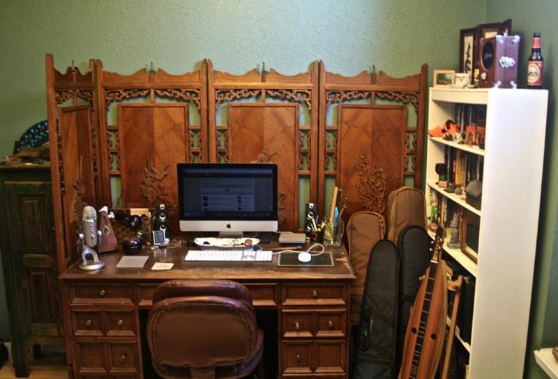 Here's my playing space. The desk and bookcase has lots of tchotchkes, and a small two headed red dragon to guard it all. The screen behind the desk is solid teak, with hand carved appliqués. I do my recordings just to the left in a corner by the door