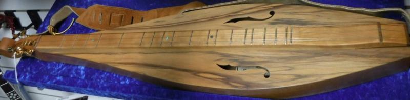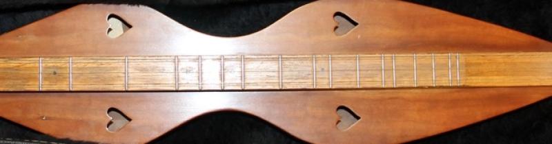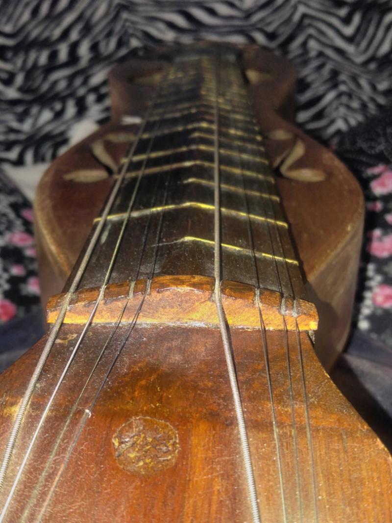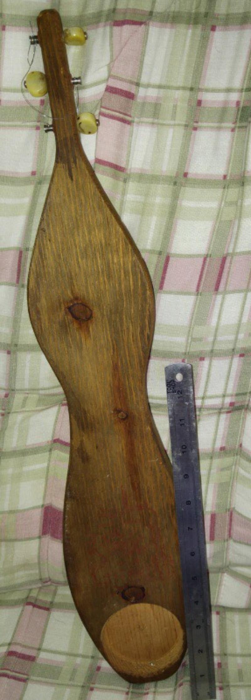 For those who don’t know, a Plickett was a small novelty dulcimer sold in the 70’s for a while. It’s two feet long, five inches wide at the bouts, and a 3/4 inch thick solid board, with a big circle cut beneath the bridge in the back, to give it a little volume and resonance.