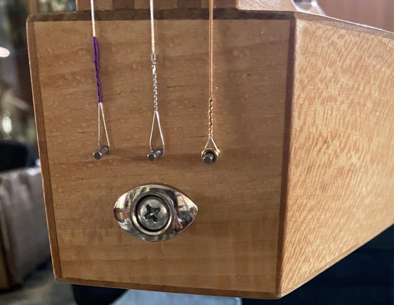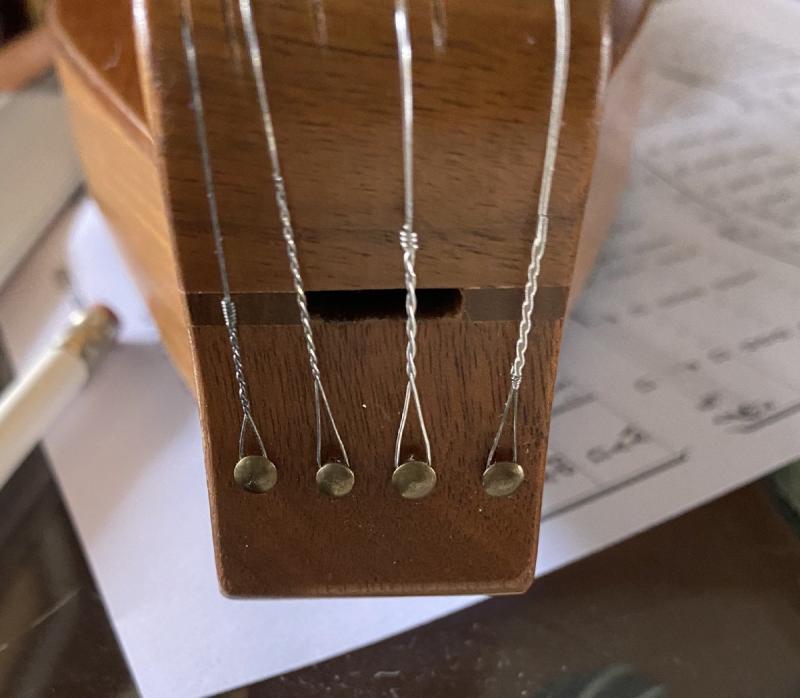 I have studied the contruction of the McSpadden and hopefully the construction blocks remained the same from the 70's to now. Sounding on the toe indicates a possible space however so I will drill a micro hole into that tomorrow. The neck is solid but I think I might use a slip strap on that if it will feed under the strings. The Scroll head has some spacing differences from the new scrolls. Will check further tomorrow and still may drill it. Have measured, sounded, scoped there is a full block on both ends. Drawing up diagrams now for placement. It is going to be within millimeters, to miss a "stay" or something more solid in the neck, and not overshoot the block on the base, while still accessing the hitch pins. And I am using oval buttons. Now if I only had an xray.