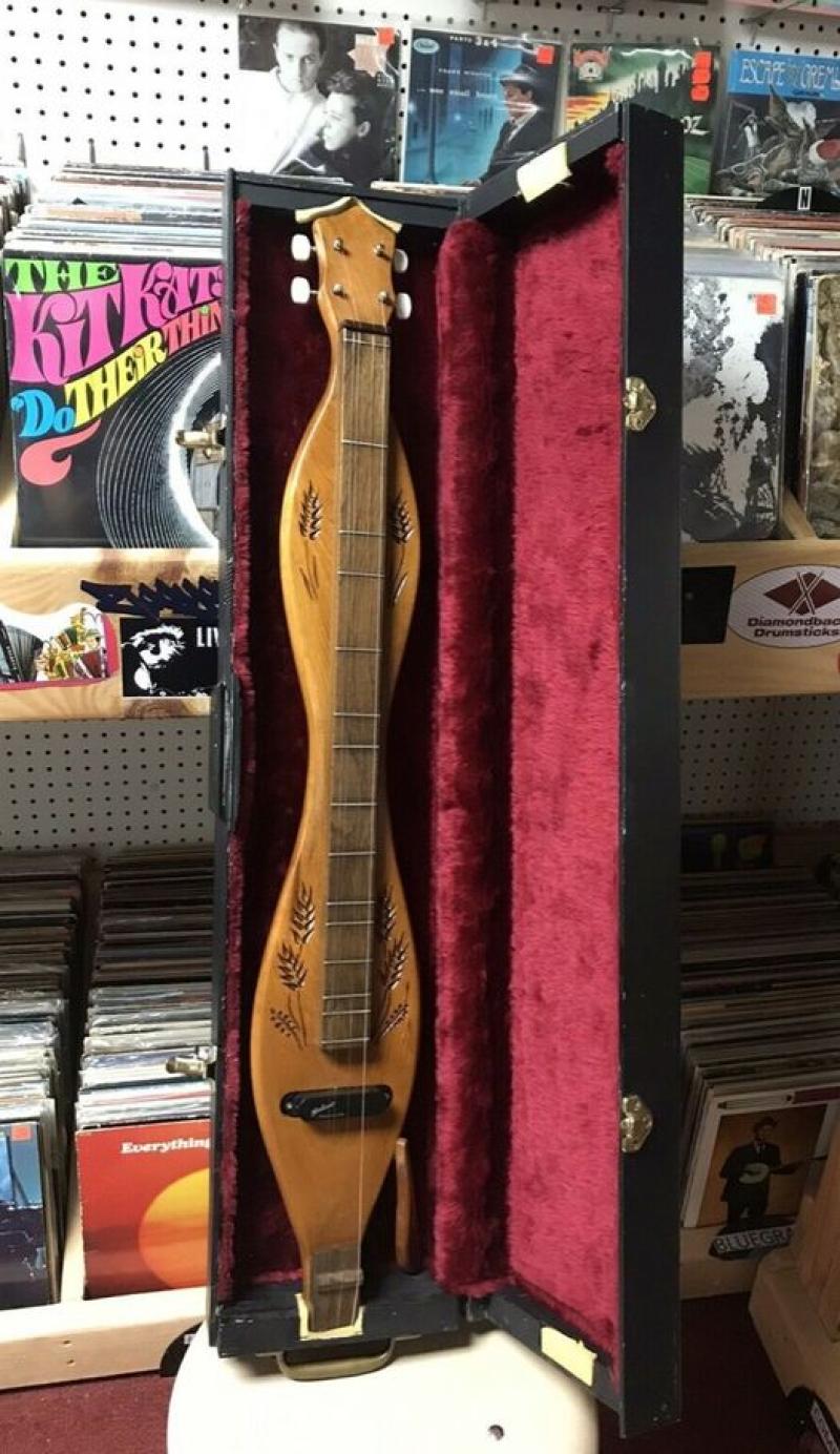 I know I have seen those wheat Sheave Design before but can't recall where. This Dulcimer had a magnetic pickup added to it, drilled a small core through the back which was wooden plugged. It is bigger than the case. Any ideas who made it?