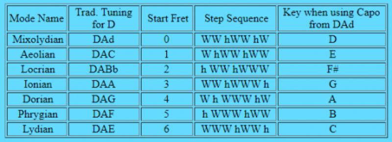 Skip's post gives you the straight dope. I've used a similar chart for years to show basic Modal Tunings. Of course those are the "key of D" Modal Tunings,, and any tuning can be "transposed" to the same Mode with other key notes (C, G, E, B etc).
