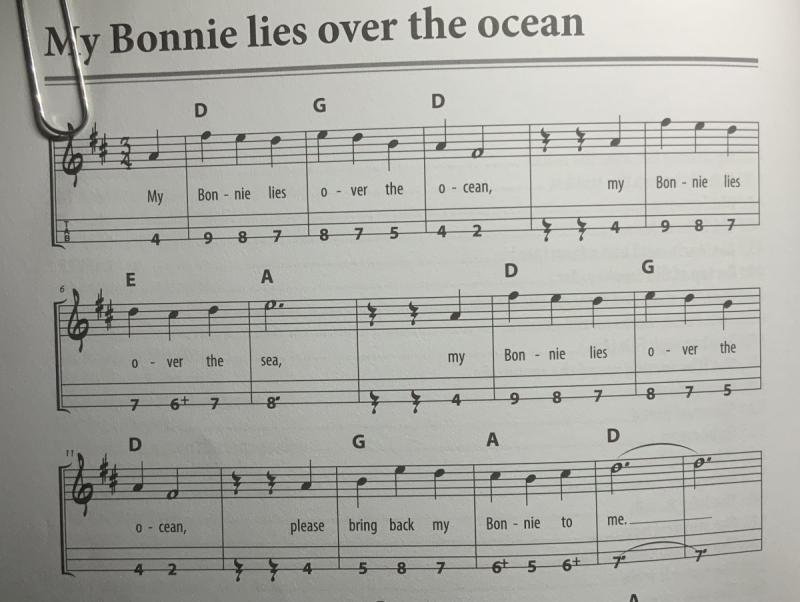However . . . and you may not want to do this . . . once you are using your fingers you are no longer limited to the melody string, and "My Bonnie Lies over the Ocean" is a good example of why. The song begins with a big jump from 4 to 9, and even goes down to 2 on a couple of occasions. That's a big jump. It's fun with a noter, but not so fun with your fingers.