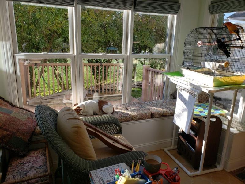 Although I have a music room in the basement (where I record vids) and another small (rarely used) one off the living room...I find myself most often sitting in my "Cozy Corner" to do some spontaneous playing. I also love to see individual music rooms too...get some tips on features and organization. Any places you love to play. I love that you include your fur-babies and family history.