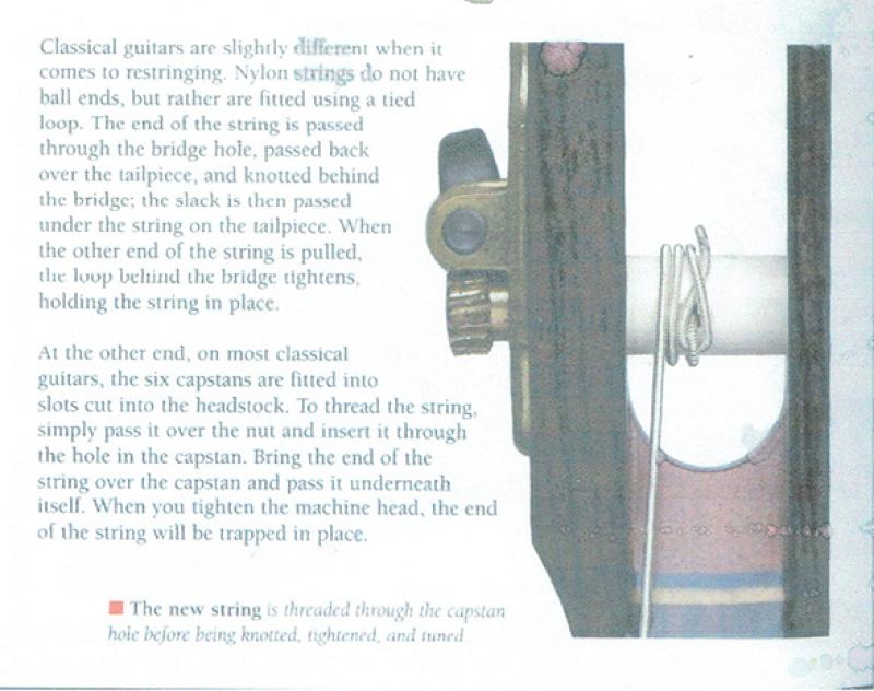 When re-stringing, only ever mess with one string at a time. Off comes the Bad String. On goes the Good String. The new Good string has to go around the post the same way the old string did (clockwise or counterclockwise). It only needs to make a couple turns around the post and through the hole -- trim off the excess string. Turn the tuning knob until the new Good string makes at least a dull twang. Tune the new Good string as below. Rinse and repeat with the other strings.