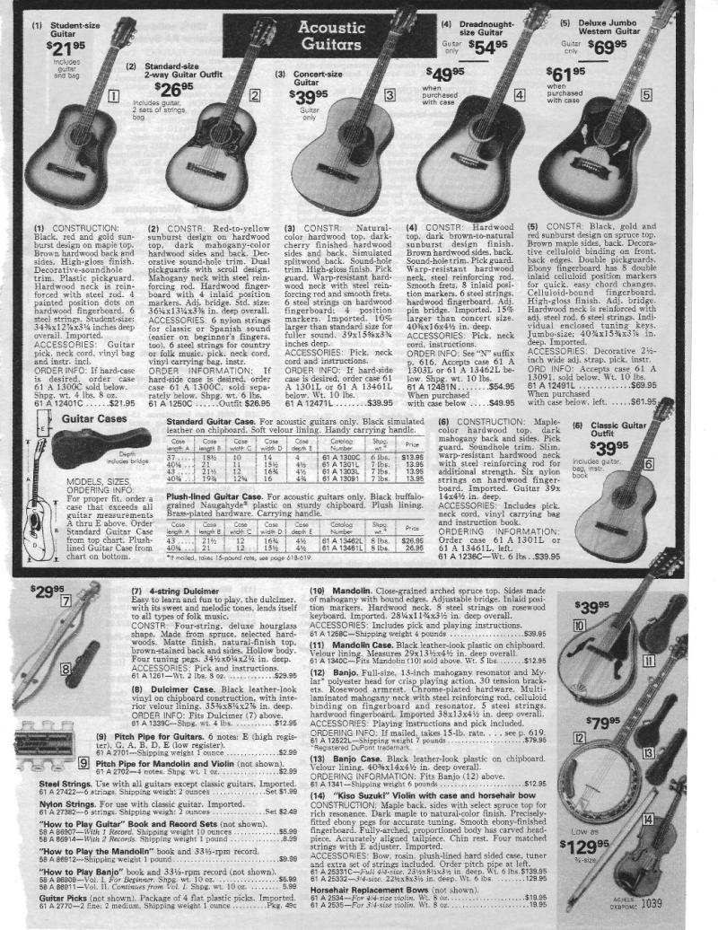 Not being a good archivist, I did not write down the years of these three pages from the Sears catalog. The other attachment is a similar dulcimers marketed by Fretted Industries. Note that the Fretted Industries dulcimers have a rectangular end to their scrolls.
