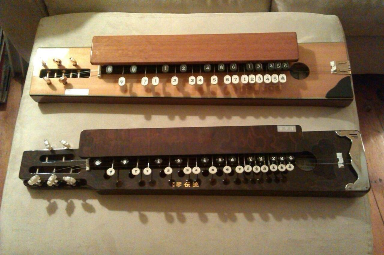 I found these taisho kotos in a flea market in Georgetown, Ontario. The bottom one had a price tag of $65 and when I went back to buy it for my friend Steafan, the seller said that I could have two for $100, so I just couldn't say no. These are played by strumming the strings with a pick near the bridge and pressing keys to stop the strings on the fretboard below the cover.The white keys are se up like a dulcimer's frets and the black keys make it chromatic. There are 4 melody strings tuned with three in the upper octave and one in the lower. There is also a bass drone string.