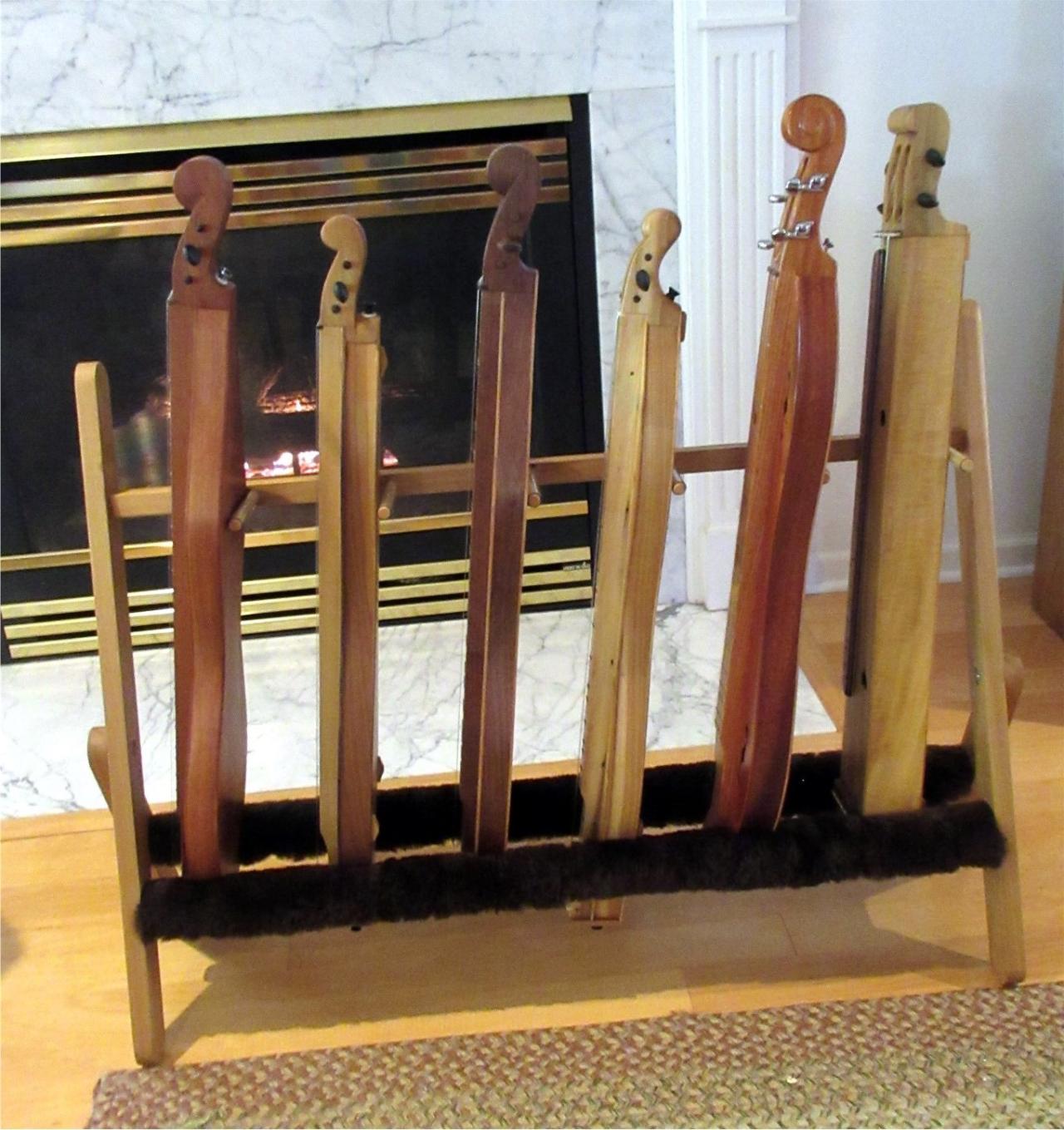 Thought I'd share a photo of my new multi-place dulcimore stand. Designed by Dulcimore Dan. The padding on the bottom supports is strips of sheep skin glued on. And, No, the dulcimore don't stay in front of the fireplace, just long enough to pose for the picture.
