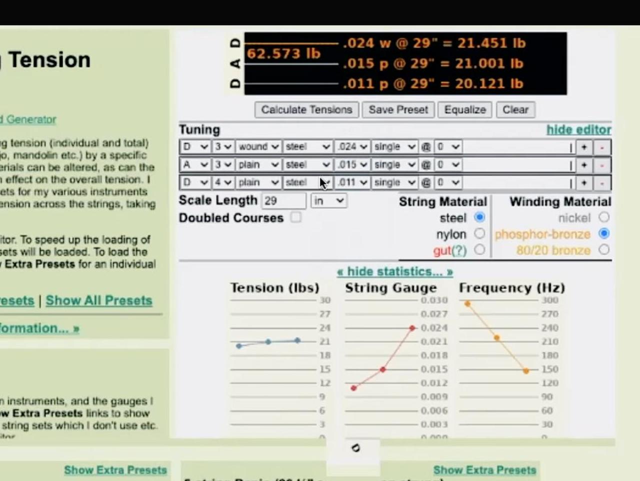 He also posted a 15 minute video (to Patreon) about how he uses it and did the example of a 29" dulcimer at DAD. I'm attaching a screen shot of those settings. You start by clicking "show editor" and then all he did was set the tuning to DAD, the octave of each note, the type of string (steel with phosphor bronze winding) and then entered the string sizes he thought he wanted and clicked "calculate tensions". It produced some graphs, and in that case it showed the middle string as having a somewhat lower tension than the other two, so he clicked "equalize" and it changed one string value to bring them more into alignment. He also mentioned that tension in the 20-30lb range were safe and a bit on the light side (for slide, that is) and anything in the 50-60 range was risky as far as breaking. You can also set it for more strings, either single or double, so it's very accommodating to all kinds of string instruments and several kinds of strings. He said he's found it to be useful, and at the least it'll give me a place to start! I encourage you to check out the tool and play with it! I haven't yet, but I wanted to get this up on the forum ASAP.