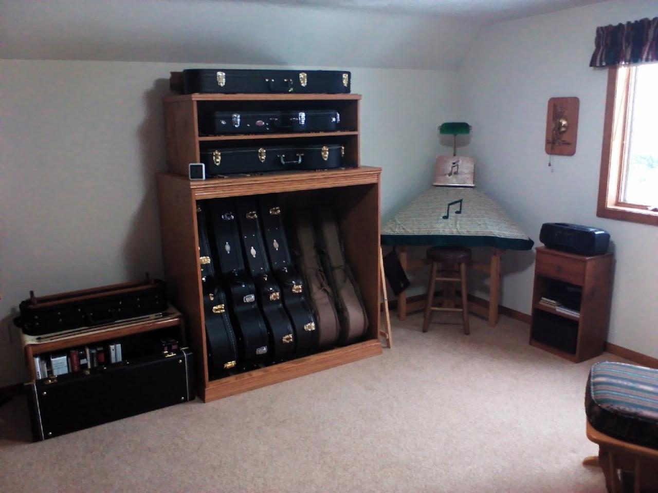 My husband built me an oak "entertainment center" (as I call it) for my instruments. This picture was taken a while ago, and I now have 3 instruments that don't fit. So, this winter he'll be building a second unit for the "overflow". The shelves on top can store 2 instruments each, so the dulcimers all go on the top part. I like to store them in their cases for protection. All the instruments get played quite a bit....takes no time at all to pull one out. The whole music room is humidity controlled (as well as each floor of the house).