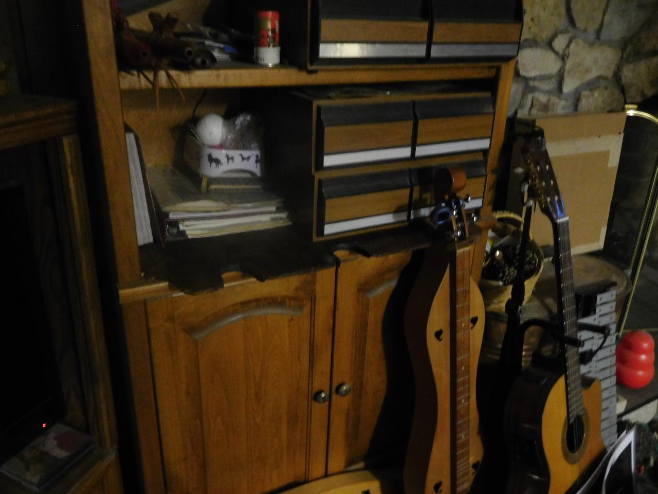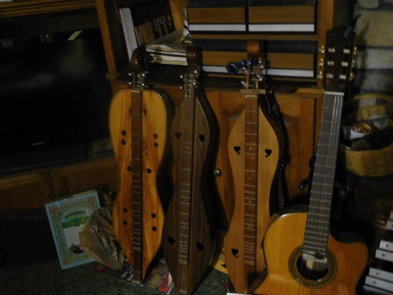 A 4th dulcimer I call "the Orphan" lays in the space at the bottom between dulcimers and bookcase. It's the dulcimer that started me on my D ulcimer A cquisition D isease as I found the poor thing abandoned in a flea market. It's not well-made, but I keep it in Aeolian for rare use or offer to loan it out explaining it's my least valued. I also have a small inexpensive travel dulcimer in its case.