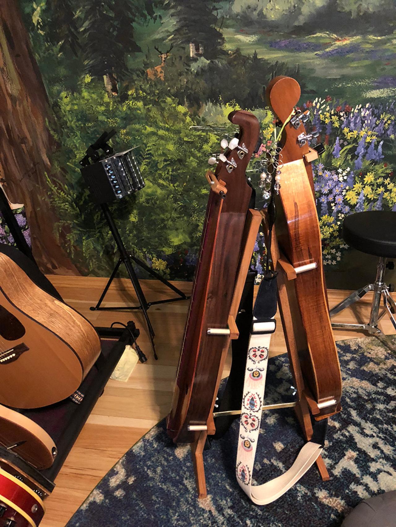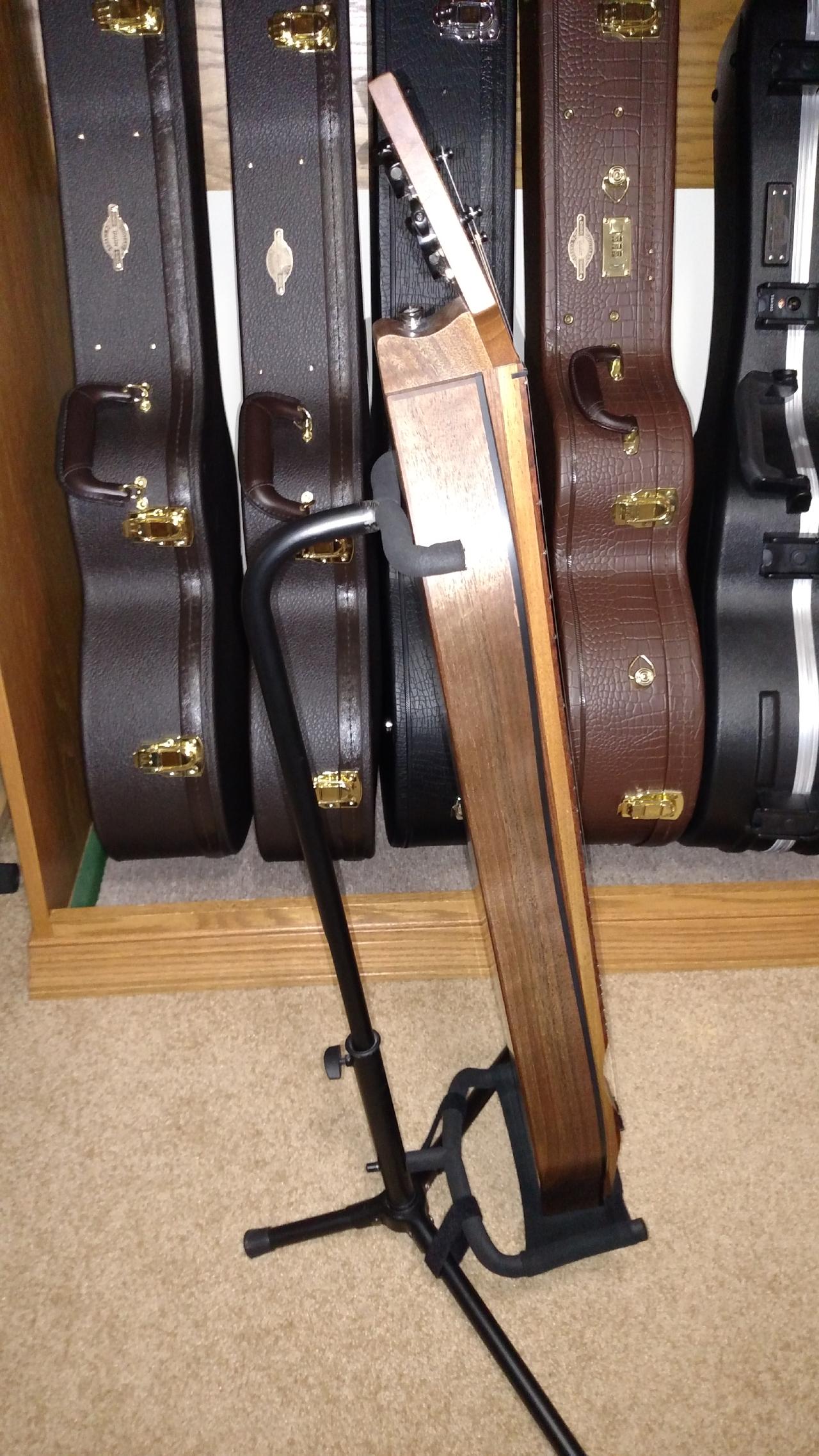 Thanks for the post @elvensong. I designed my stands to fit tight spaces, between my chair and desk, etc. They occupy 16 sq in. of floor space, and I can lift my dulcimers straight up for easy access. The stands lock for stability, and are padded with rubber tubing and felt to protect my dulcimers. They also fold up for easy travel.