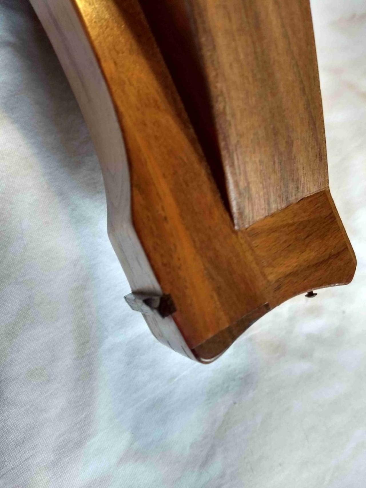 "The cut in the bridge was for compensation. The original string set is the same one we sell now as our Ionian set. The strings are all loop end type with the bass string being a wound .022 diameter and the others all .012 plain steel. The tuning would have been either key of C or key of D. For the key of C the bas string would have been tuned to C an octave lower than middle C and the other strings would have been tuned to G five steps higher than the bass. For the key of D they would have been one step higher than that (D bass and As for the others).