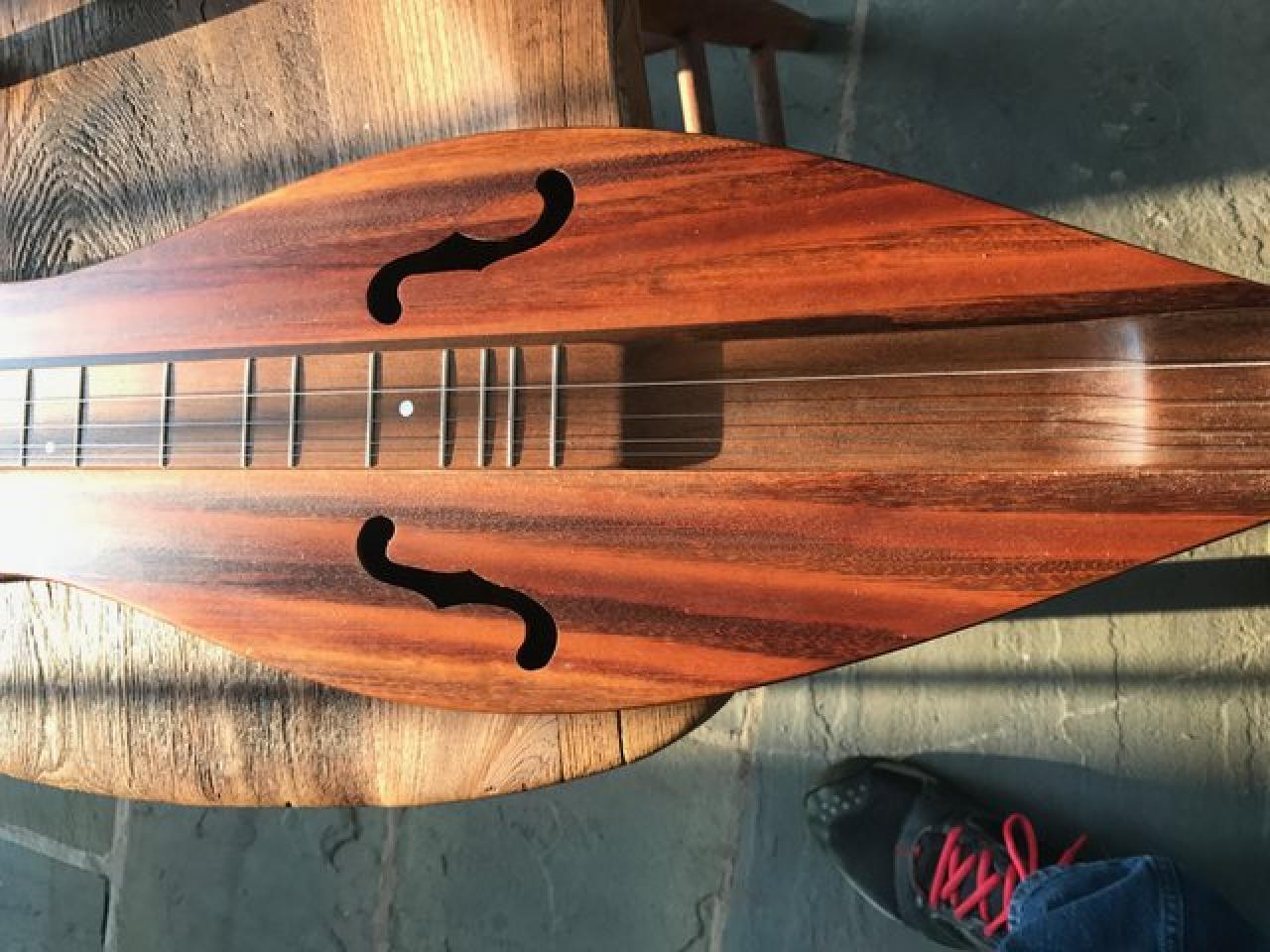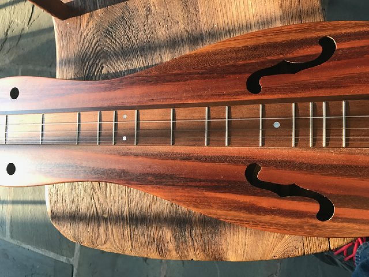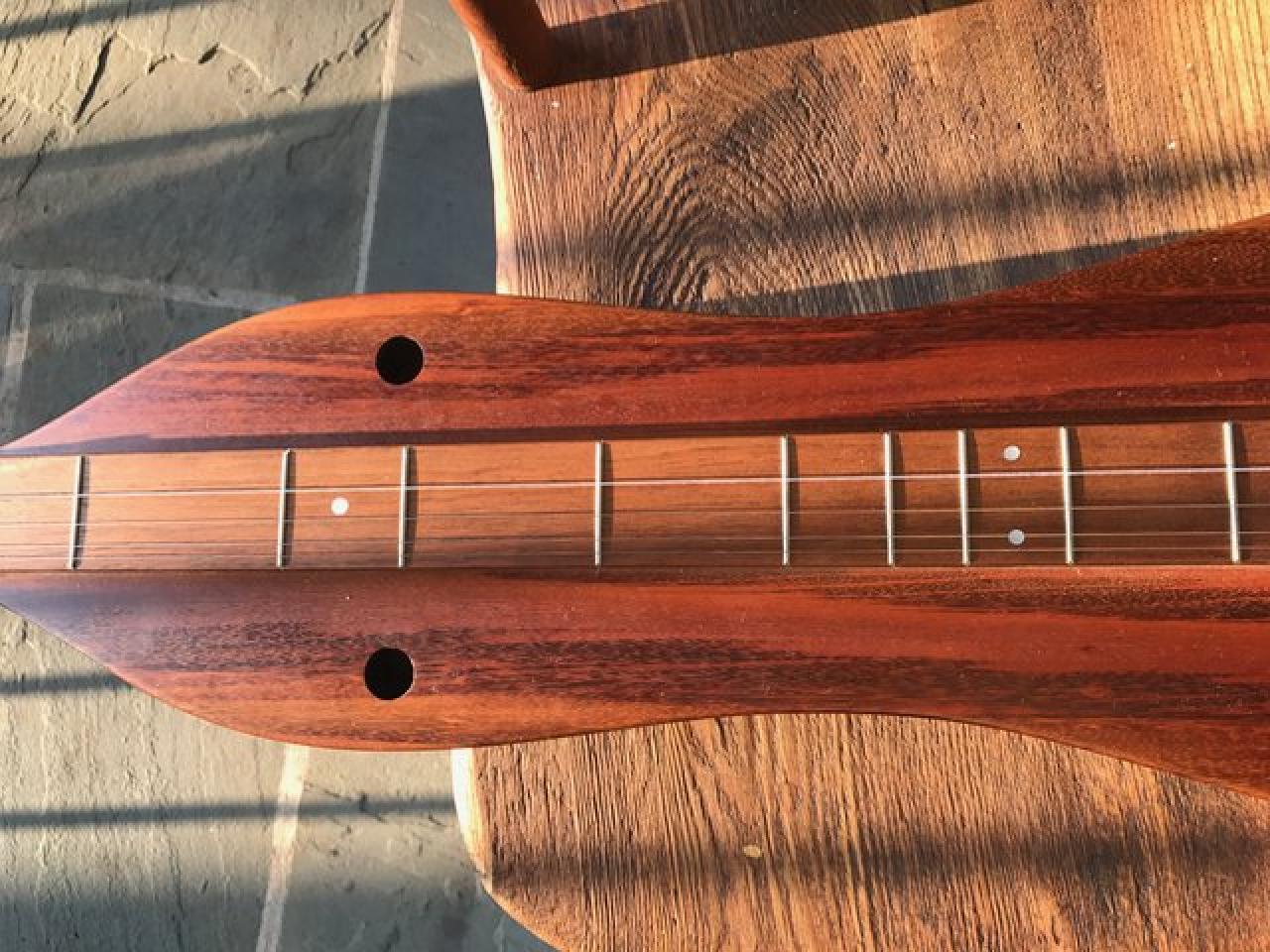 My brother purchased this dulcimer online. The gentleman who sold it said it was his son's mother-in-law's who had recently passed, but it had hung on the wall and nobody ever saw her play it. He also has a sitar of hers that was in terrible shape. :-) My brother knew I liked dulcimers and thought the instrument was in good shape and the soundboard was attractive. Also, it was built the same year as my daughter was born, so having an instrument as old his niece was fun. It had one string. So I added three more strings, but the slots on the bridge and nut were not where I would expect. I was expecting a slot in the center in the fretboard for the middle string. Any ideas on the slot configurations? Also, the action is a bit high up the fret board. I do like it's sound.