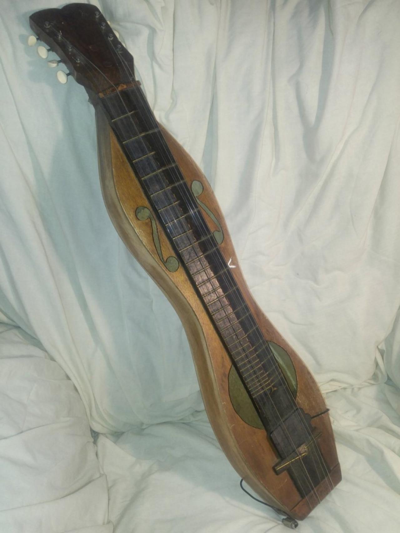 I wanted to share a picture of the used dulcimer I just got in the mail today. I thought it was very unique, and wasn't too expensive, they listed it as poor condition. Really, it's just homemade, an amateur build. I don't care, I love this thing! It's got great resonance and sustain, and the frets seem to be placed well, as it plays in tune pretty good. It's electric, but I think I need some adaptor as the plug opening is small. I'm not overly interested in the electric feature, but will see if it works.