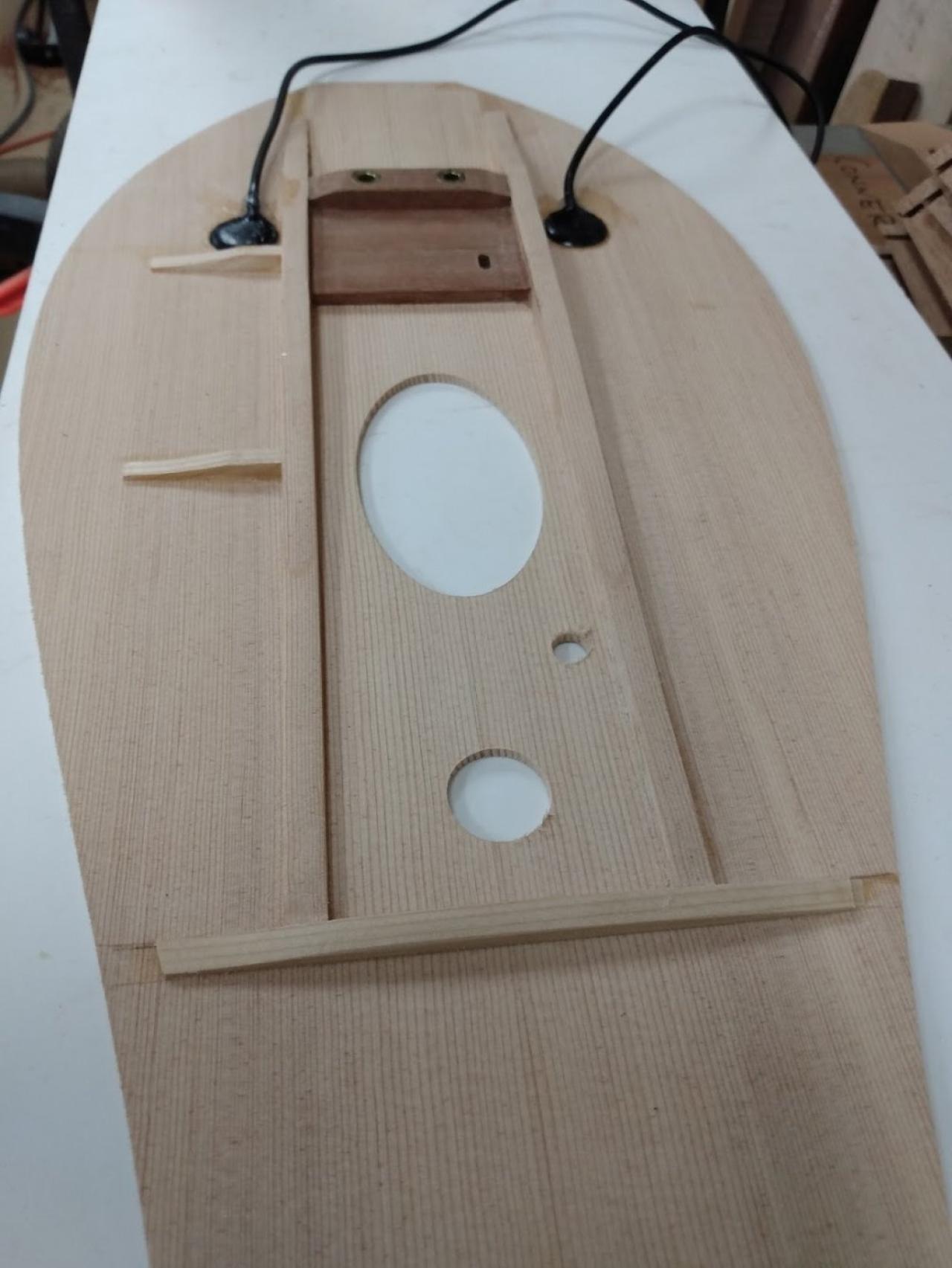 (The attached picture is my current build. You can see the thickness of the soundboard which is made from recovered white cedar. All of my builds have the neck suspended over the sound board on a single peg and a true bridge. This is a double neck, treble and bass.)