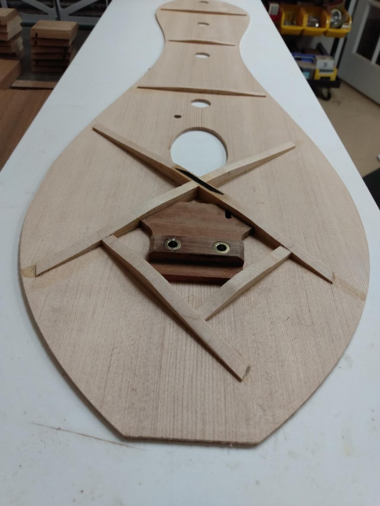 I use fan bracing that comes together at the head and spread all the way to the tailpiece. With a double neck design, you need to have a more or less wide and flat tail piece . With a single neck, generally just two braces. With double necks I find four braces emphasize the treble, three helps the bass. Similarly, straight bracing emphasizes higher pitches, scalloped bracing lower. Haven't tried mixing them in one instrument. Pick your poison.