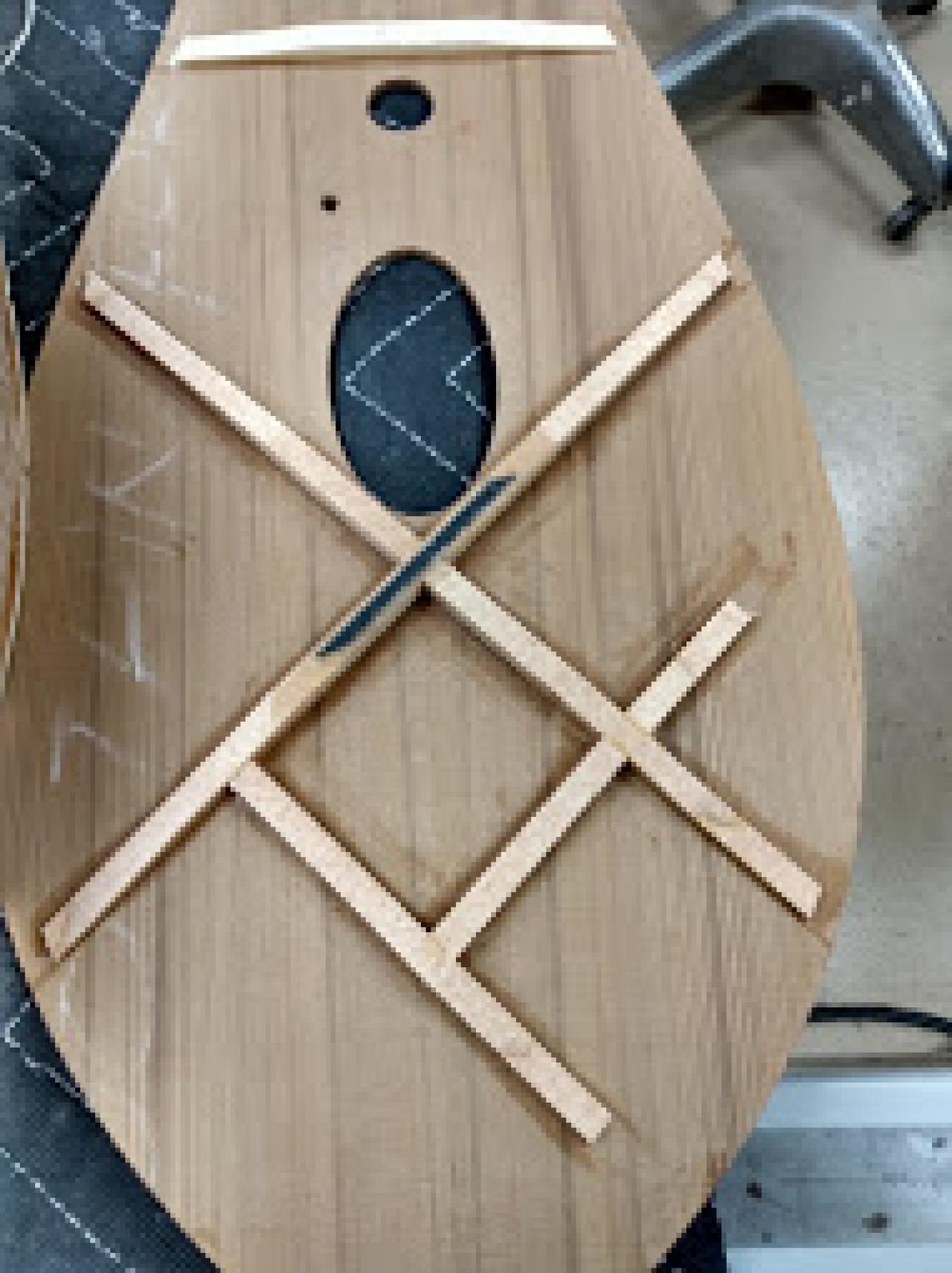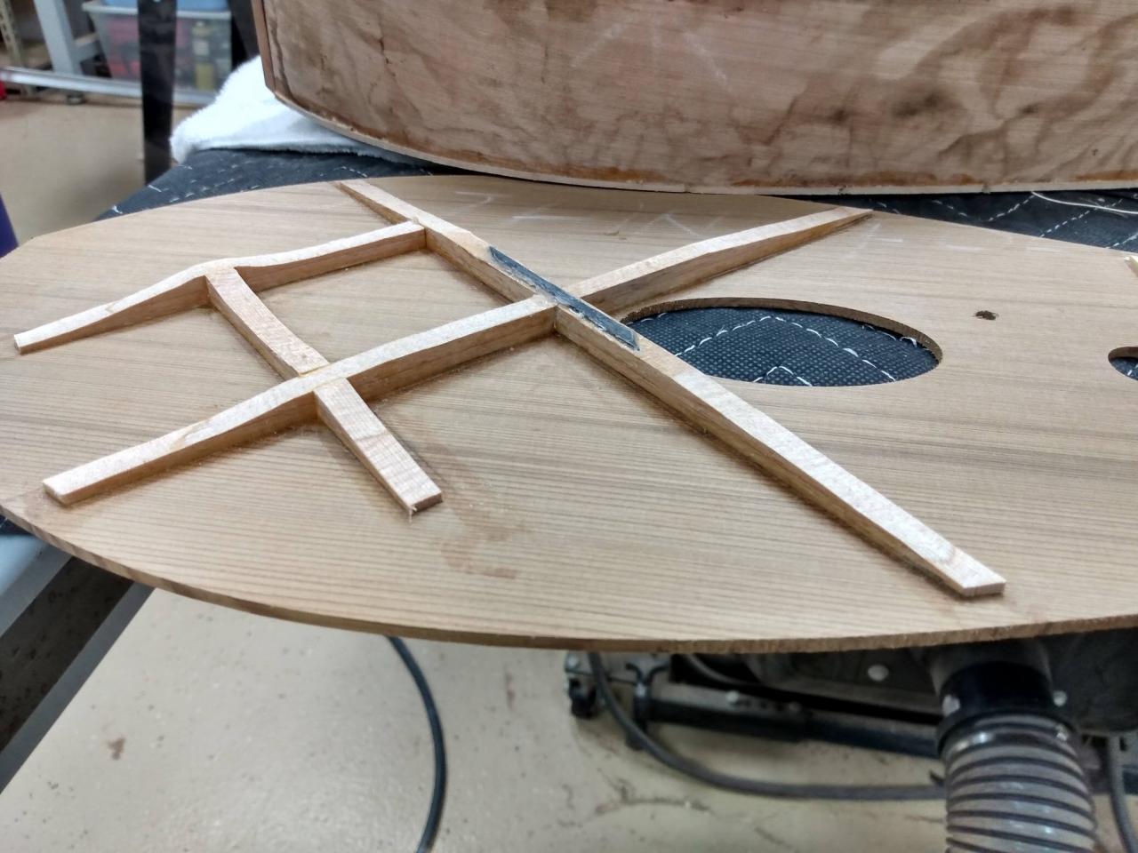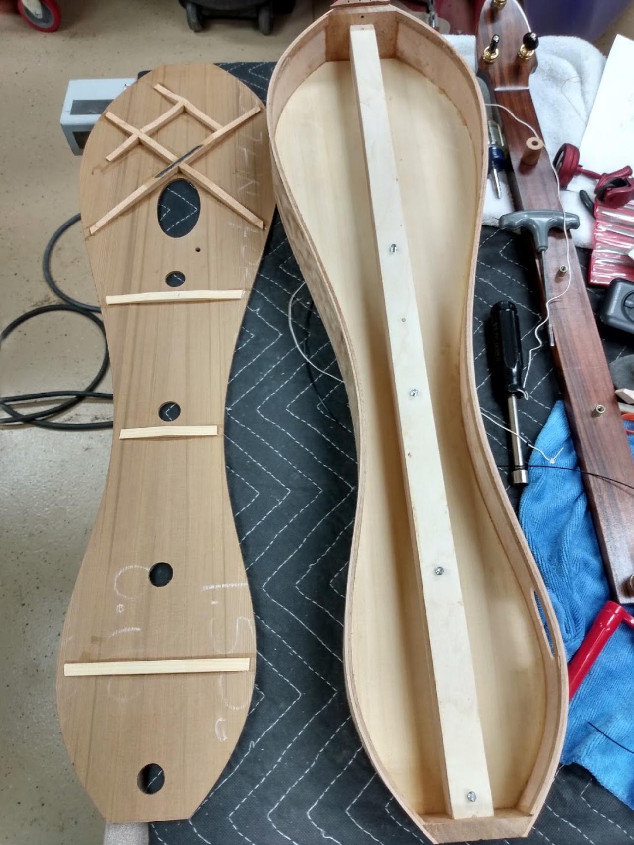 The picture shows a build in progress from a couple years ago. You can see the fan bracing on the soundboard. The X-bracing on the bottom is used so the bottom can be rounded.