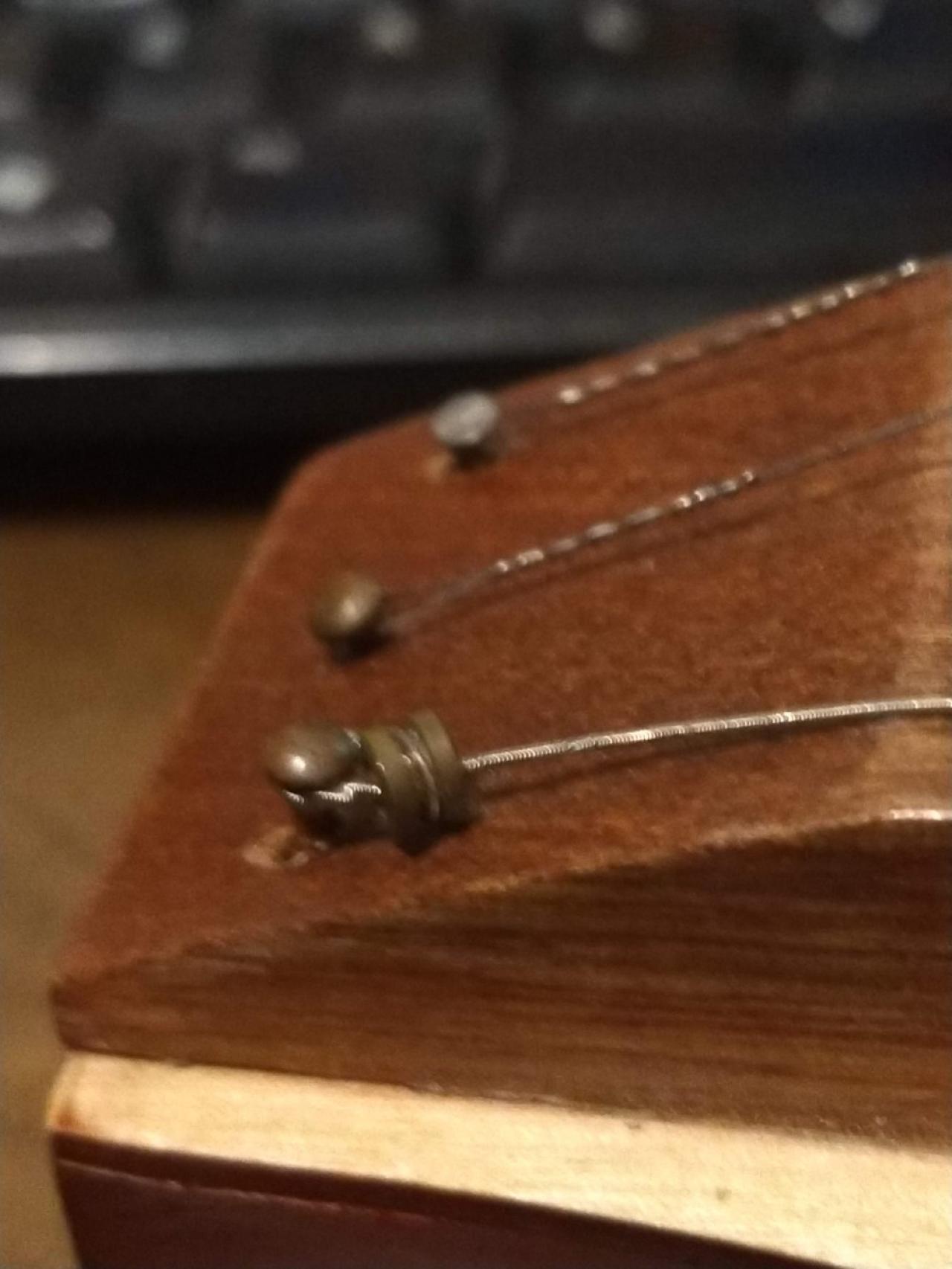 The problem the both have is that the anchor(?) pins at the base of the instrument and not in good shape at all. They look like someone tightened the strings to tight and they are pulling out. Odd thing is that they look like small brass brads like you would use in finish carpentry. A couple of them look as though you would have had to set the loop end on the string and then tap the 'brad' into place to hold it.