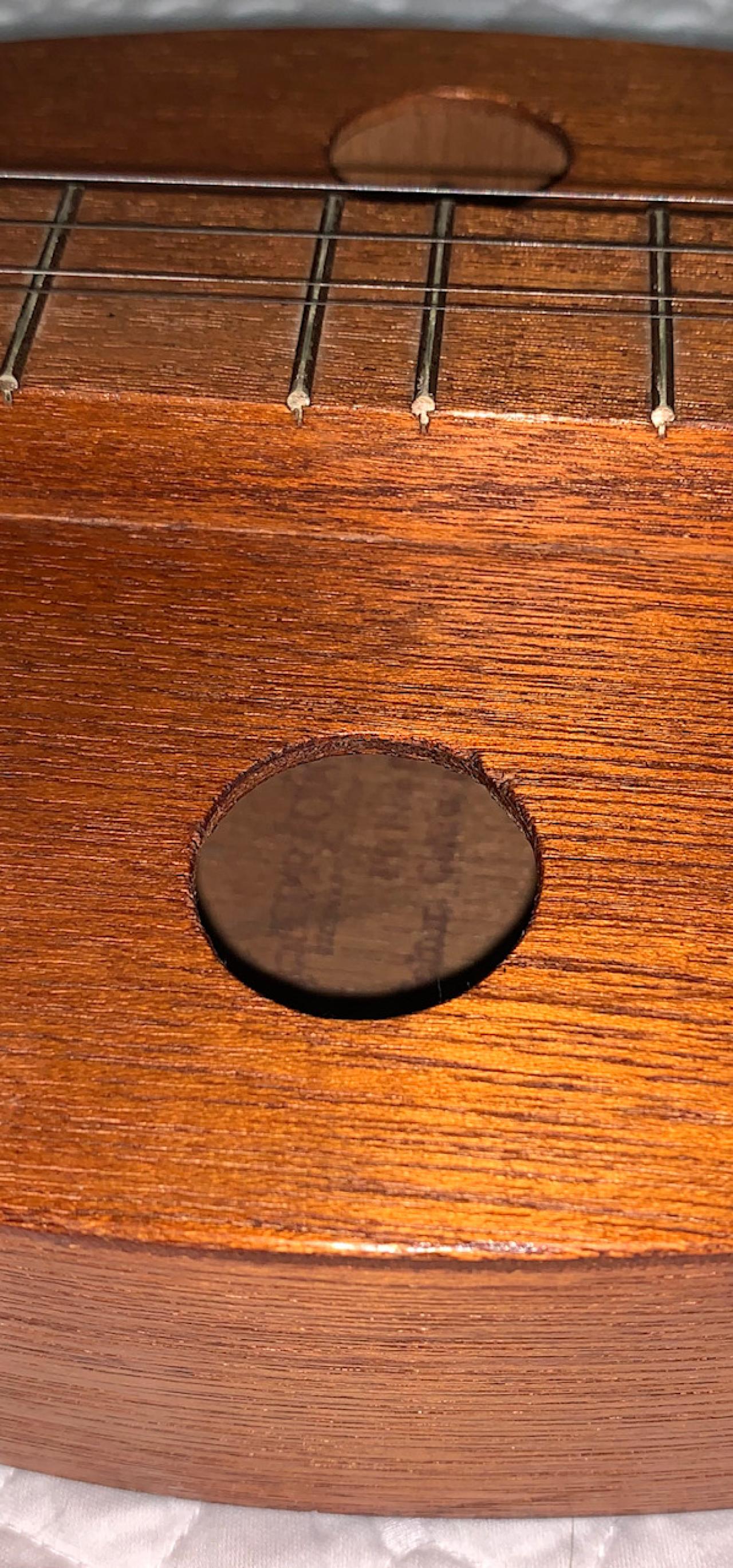 Inside the sound hole you can see an ink stamp and not a paper label. It reads CapriTaurus Dulcimer made in Felton, California. It has round sound holes verses hearts.