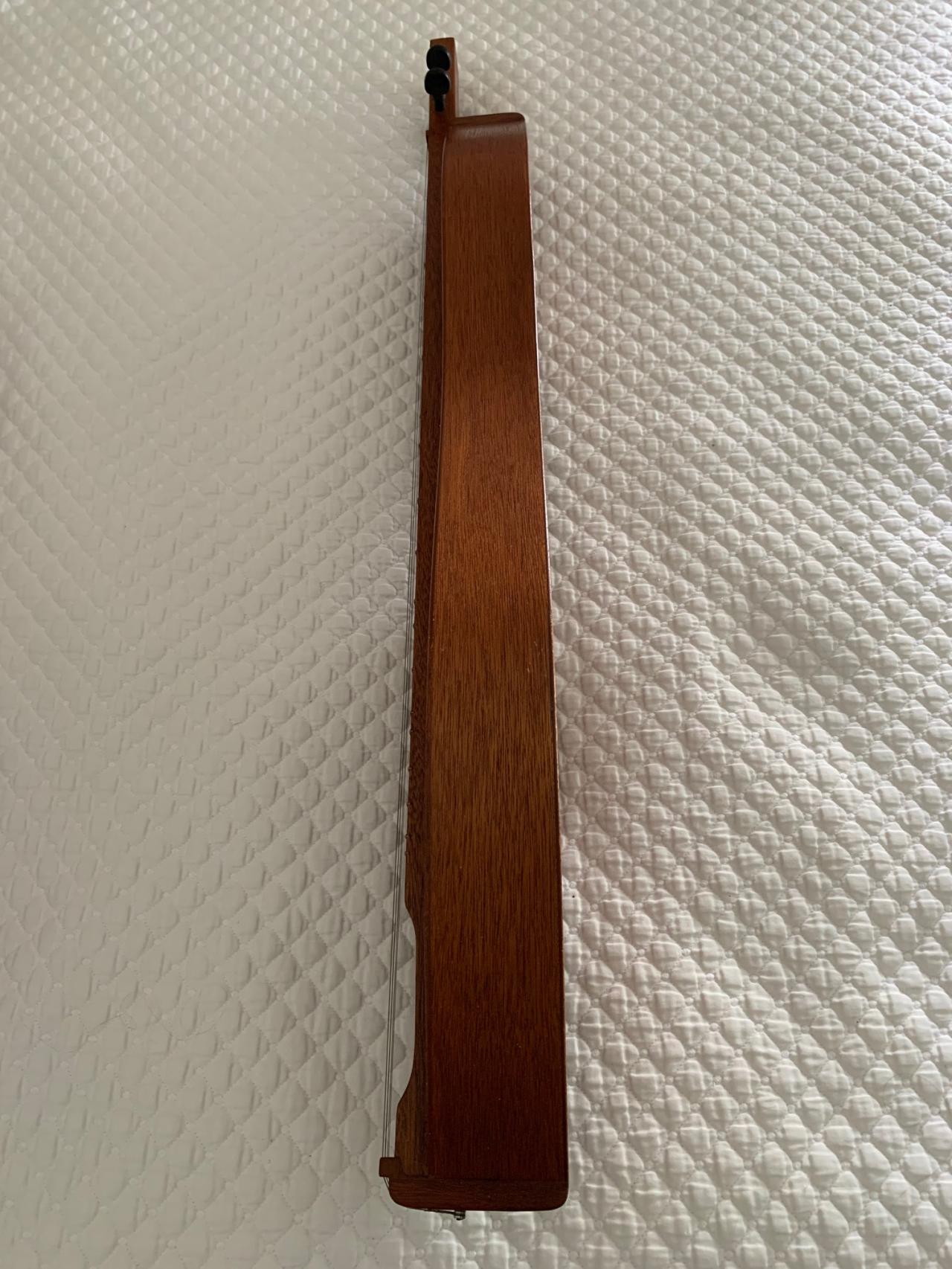 Howard Rugg the craftsman who made this dulcimer said he guesses its from 1969-71 when he just opened his shop in Felton, CA. He said it was made before guitar machine tuners. It is mahogany plywood body, solid wood fingerboard and tailpiece with violin tuners.