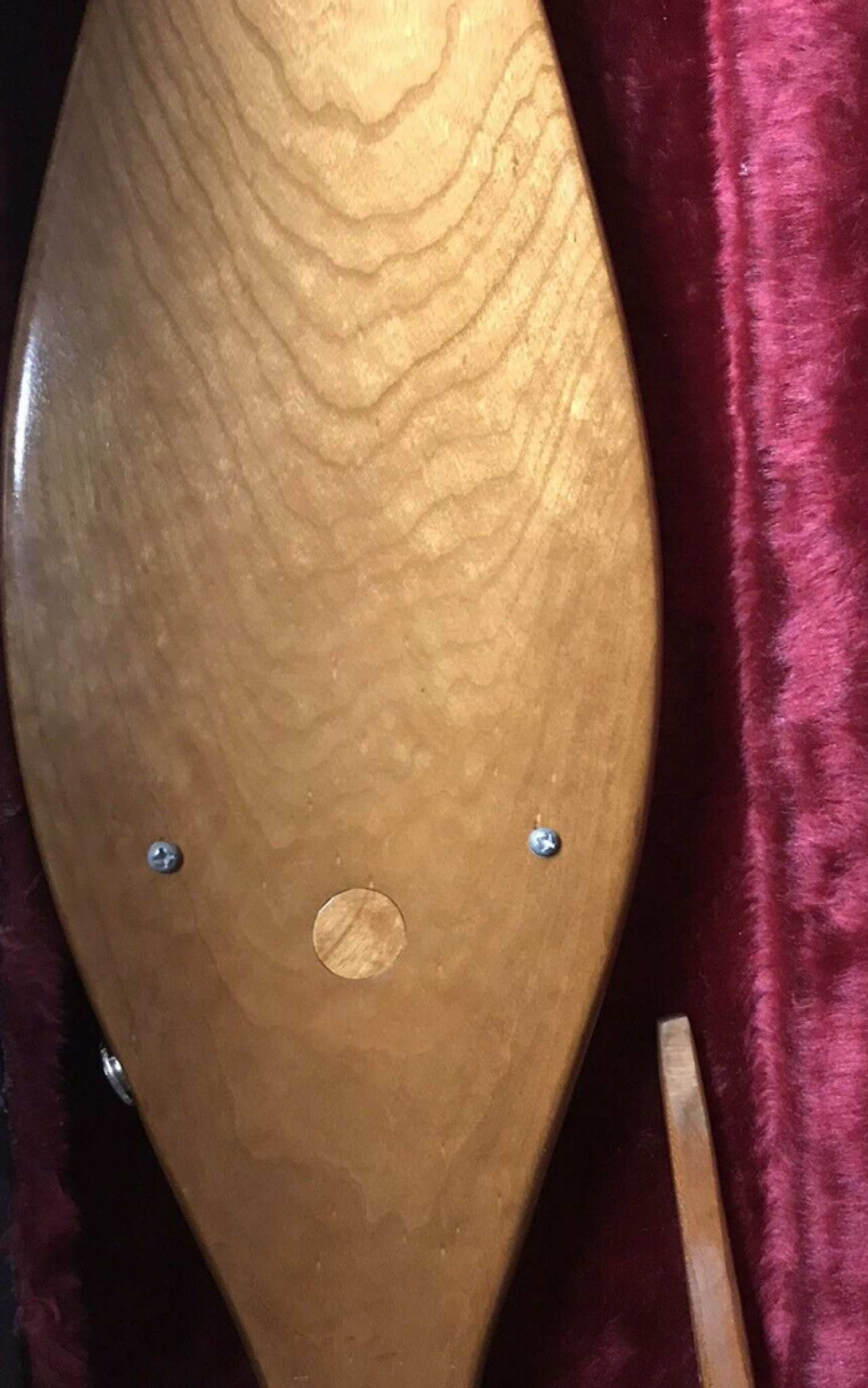 The entire dulcimer is odd. Beautifully done, carvings excellent, yet electrified I am sure after the fact. Otherwise the plug could have been drilled properly and replacing it would have matched the back. Or the access could have been drilled from the side and replaced with a preamp volume control.
