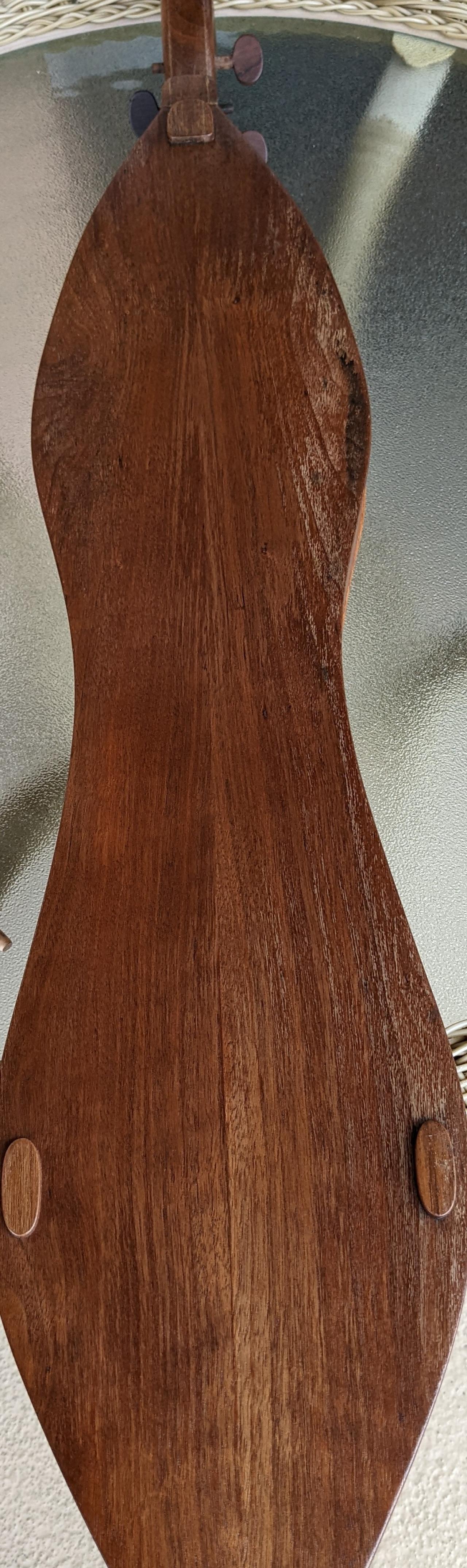 Ken, I thought you might like to see more photos of my dulcimer.  Attached are photos showing the label, back with feet, and a side view showing what I'm told is unusual, 'open' fretboard sides.  Reminds me of a Roman aqueduct.  There are openings cut in the dulcimer top, somewhat corresponding to these fretboard openings.