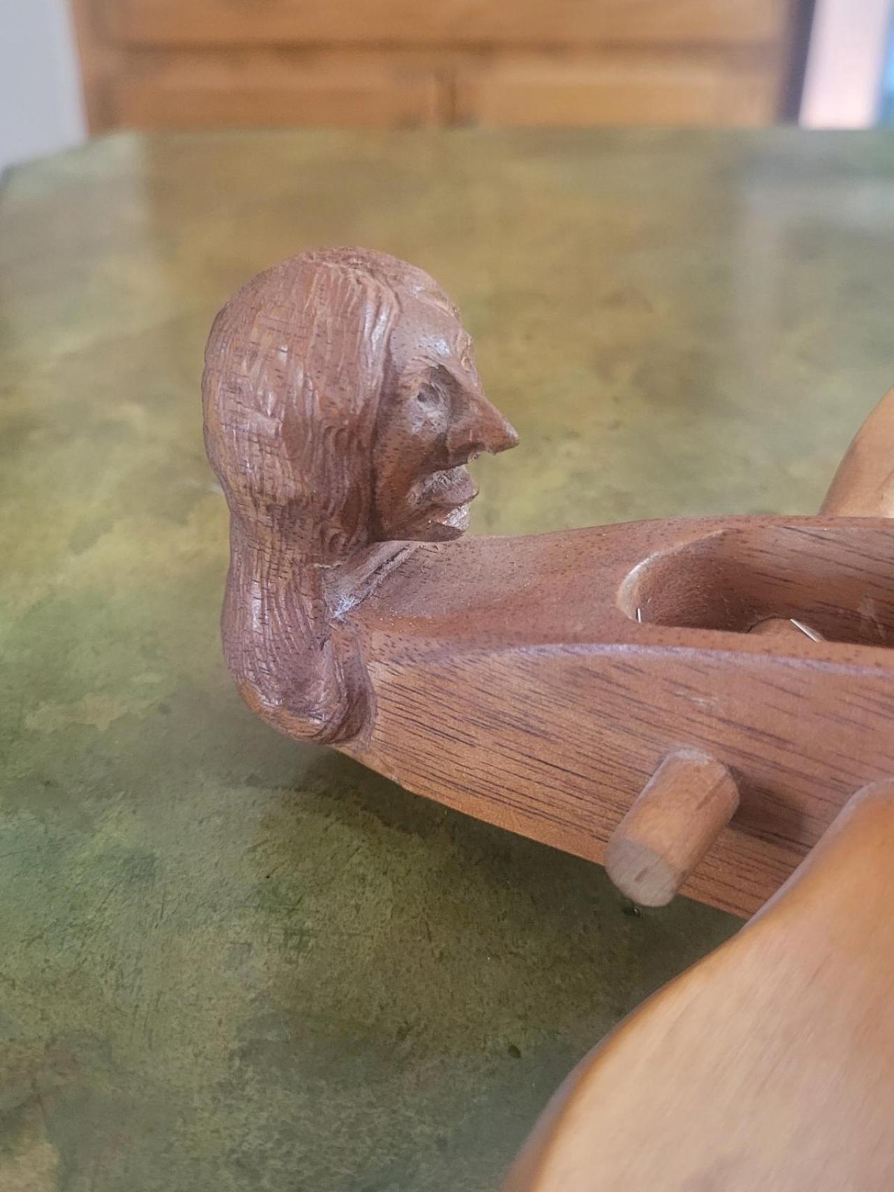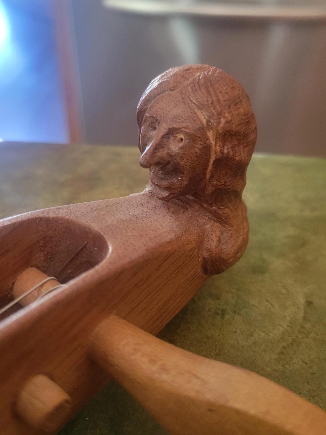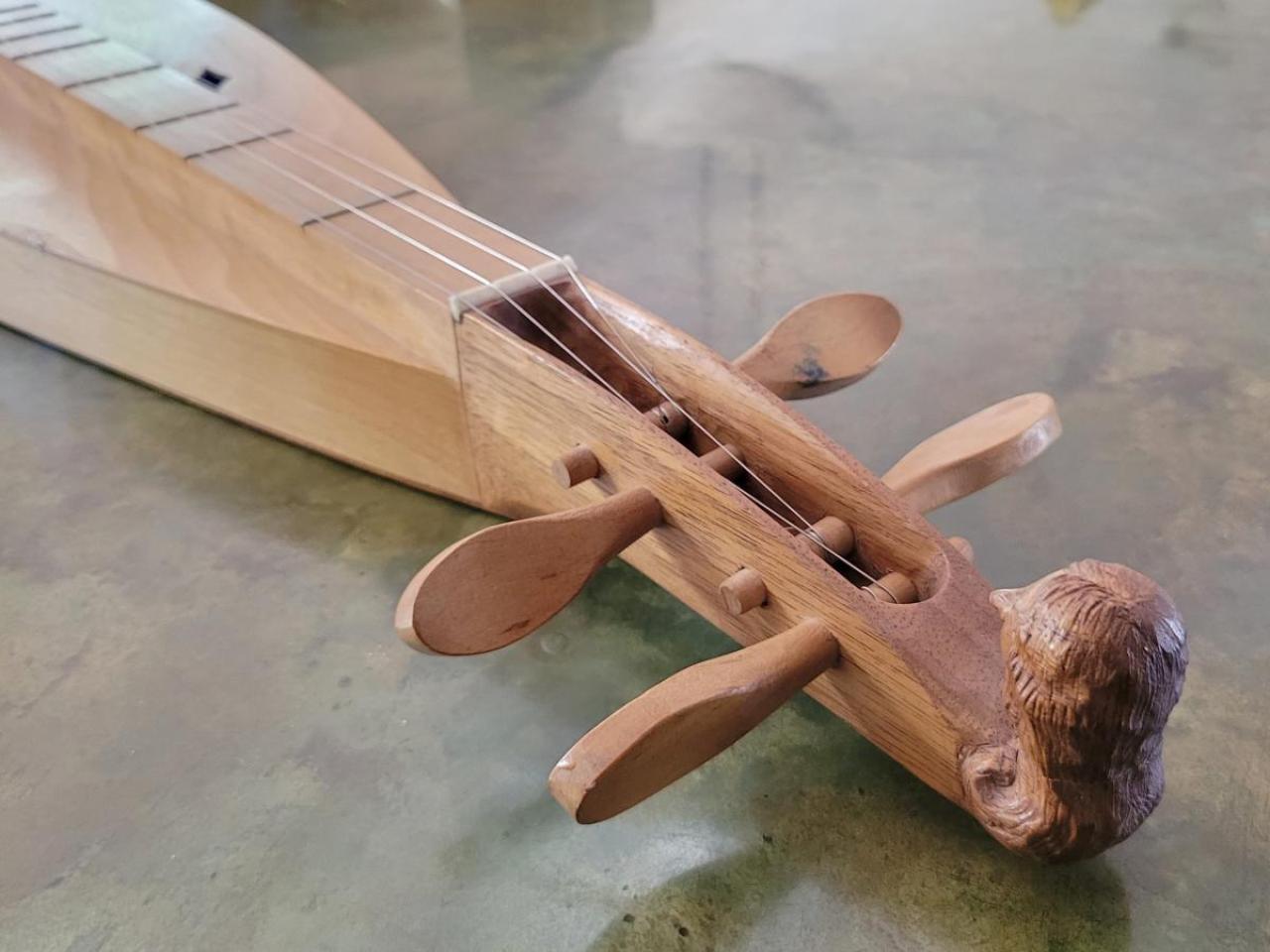 Hello all, I wonder if anyone knows who made a dulcimer my stepmother just gave me. She told me this dulcimer was “made for her by some guy she met riding a train down the east cost of the US in about 1970.” She does not remember much of the event, only that the man was very nice and upon learning that Jane (stepmom) was a music teacher, offered to make her a customer dulcimer. Her choices for peg box decoration were a dog’s head or a woman’s head, and she chose woman’s head.