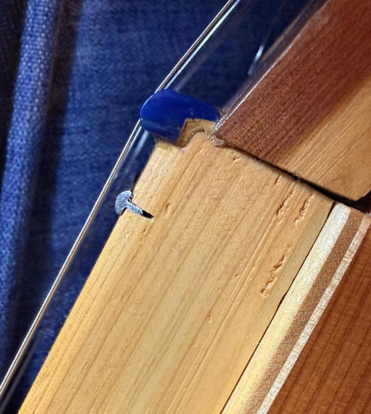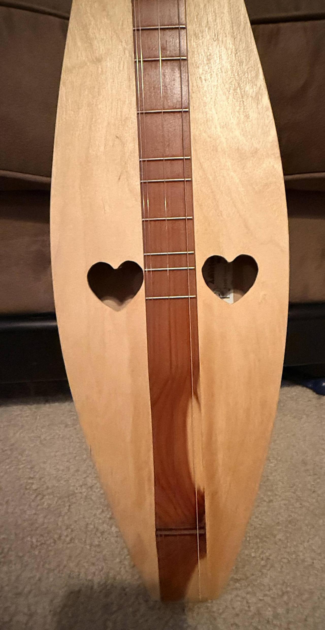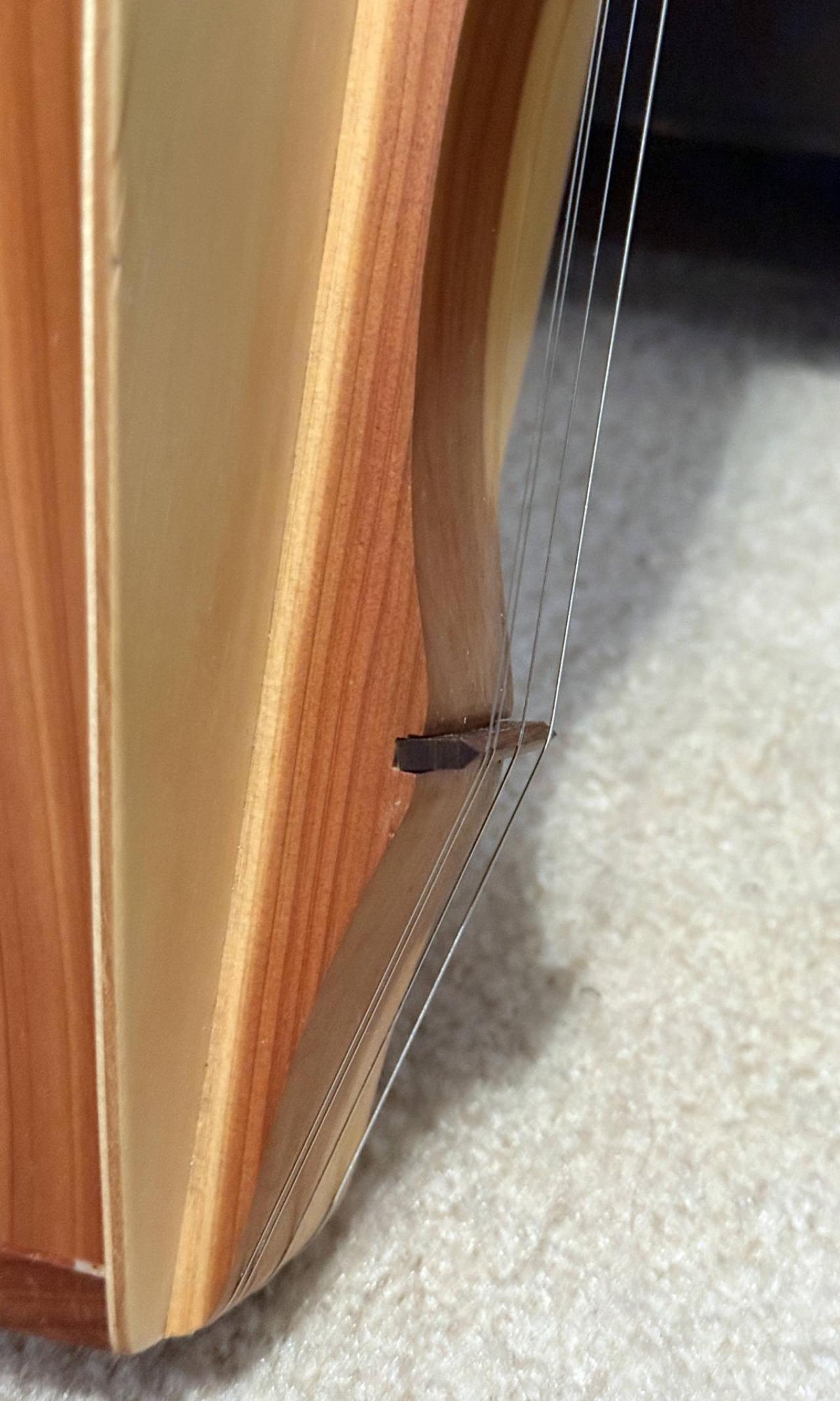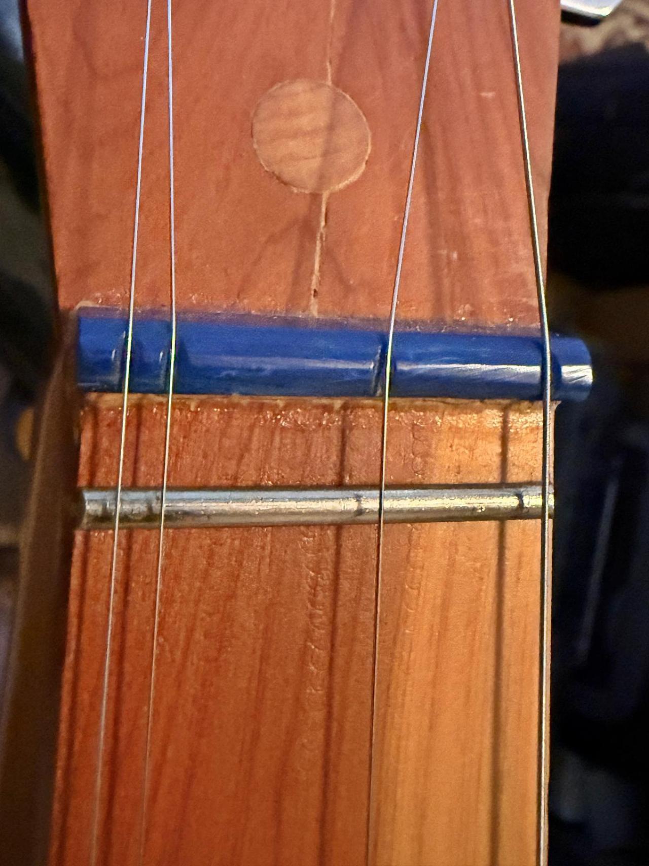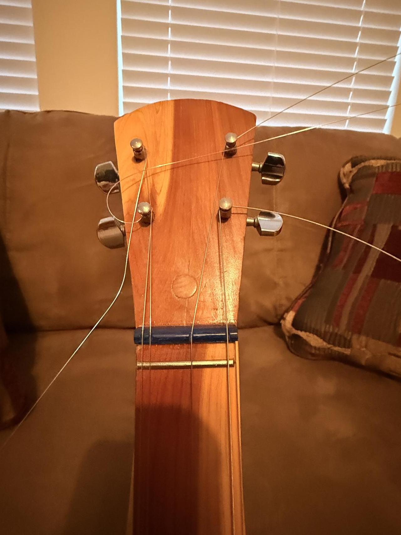 I think I will try cutting the slots deeper in the "nut". I really do not want to ruin the dulcimer as I do not have very good woodworking skills! I probably should have invested in a new better brand instrument, but I am just a beginner at this and did not want to spend a whole lot of money. Knowing me though if I saw a good deal on a better one, I would probably buy it! The one I got from Amazon is really nice though, but I know it is nothing high end. I did a little research on the shop that is named on the sticker inside the sound hole. Apparently, the phone number is still good, and the shop may still be in business, but the instruments designer, Jerry Meador passed away in 2018 at the age of 68. I am going to guess this dulcimer was probably made in the 1980's. I was able to find a few other photos online of the same model, and one had a black "nut" and the other was like mine, but I could not tell where the strings were in relation to it. I will keep you all posted of any progress I make!