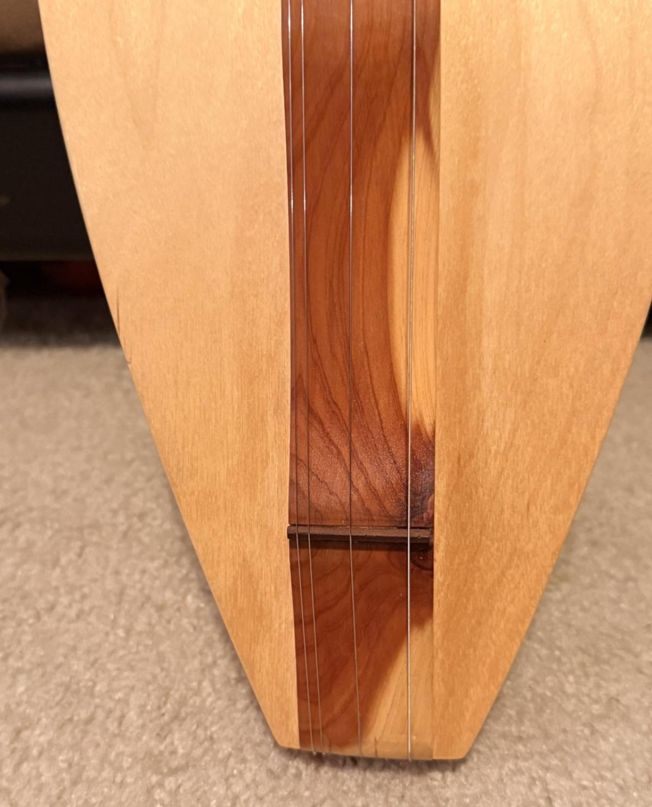 First time poster and first time dulcimer owner! I recently purchased two dulcimers. One was an Applecreek AD200 cherry model from Amazon and I have been very happy with it. Its finish and sound quality exceeded my expectations. I also wanted a US made vintage model so I started looking on Ebay and there was a lot to choose from! The first one I purchased I returned because the seller put down the wrong dimensions for it, and it was too small for my taste, but sounded OK, I finally found one that was the size I was looking for, and it arrived a few days ago and that is where my question starts! It does not have a brand name on it, but a sticker inside the sound hole that states " The Beaten path, Home Of American Dulcimers" in Pigeon Forge, TN. It also shows two names, Jerry and Marsha Meador. I see no date or model number so I am assuming they made this instrument. If any of you know anything else about them or this dulcimer I would appreciate it also! Anyhow, the dulcimer was in pristine shape except for a crack in the headstock, but it does not appear to run very deep. I cleaned it up and put new strings on it and tuned it. It sounds great when just strumming an open cord, but hitting notes up on the frets sound off, especially with the center A string. I know how to intonate most electric guitars but am not sure how to do it on this. The saddle is not movable, so I am stuck with it as far as that goes. I removed it and replaced with a bone one made for an acoustic guitar, sanded it down a bit to lower the string action, and this has helped a little bit, but it is still off. What else can I do? Any and all help is welcome! I have attached some photos for reference.