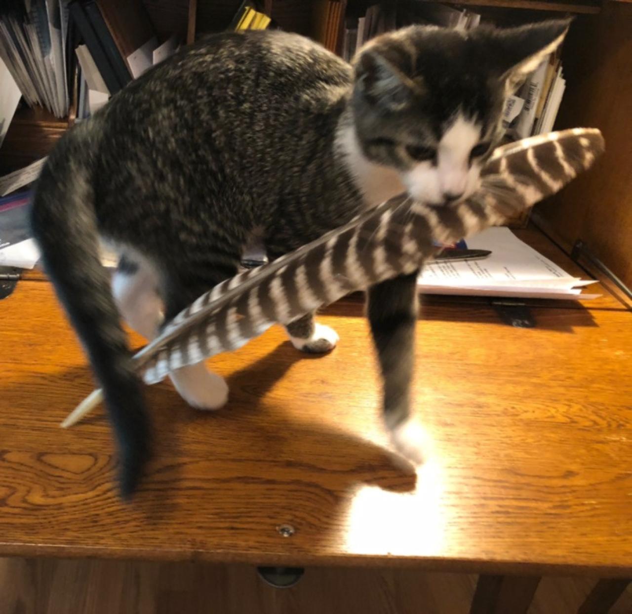 The other night, my wife had already some to bed, while I was taking care of business on the 'puter, Sally snuck up behind me on the chair I was in and stealthily got on the writing desk to my left, and quick as a wink snatched the turkey feather and went dashing off with her prize.