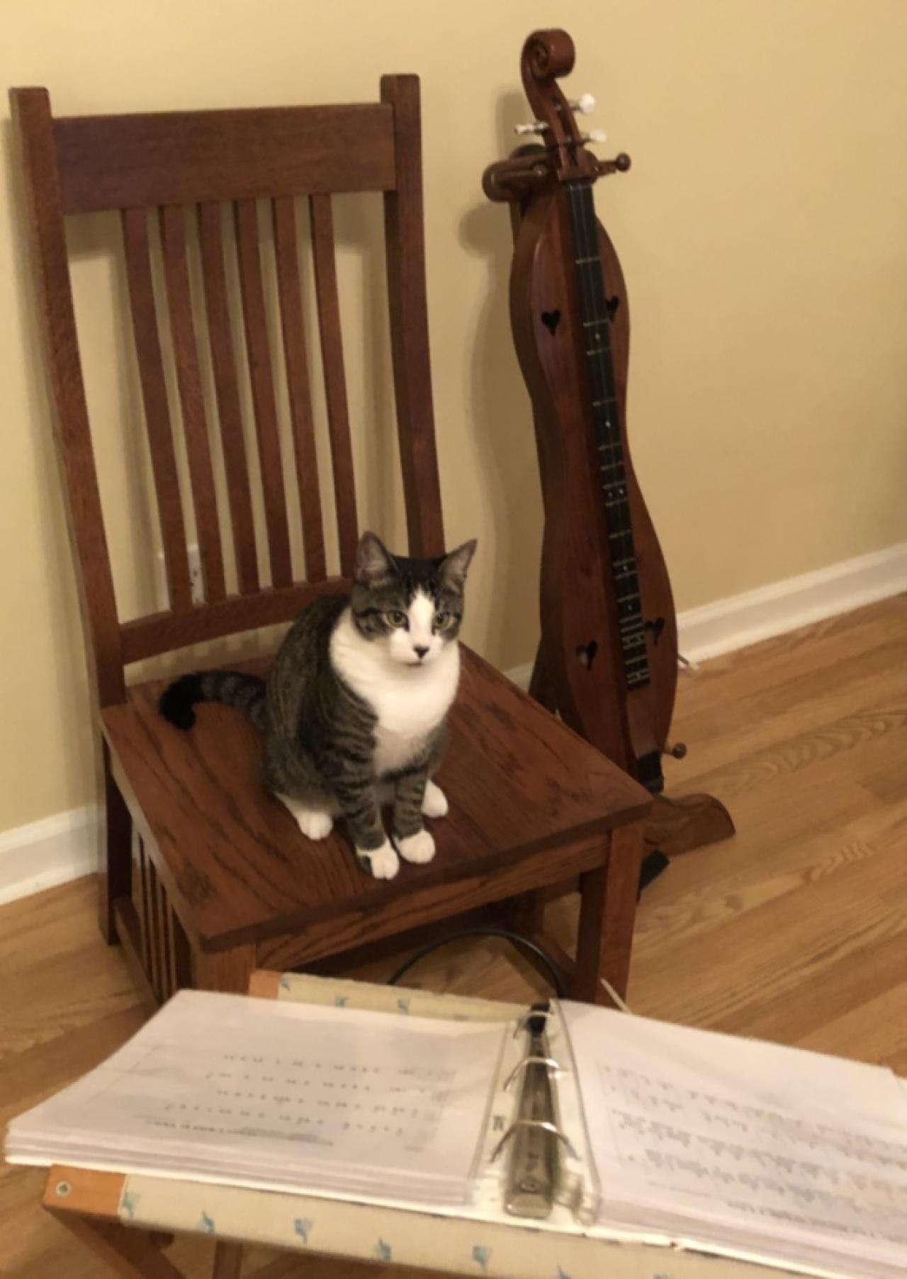 Our 3 cats seem to like it when Brian and I play tunes... as we begin to play they casually* saunter into the room (*so we won't know they actually approve of something we do) ...and they take up positions in various chairs. As though their appearance was all accidental.