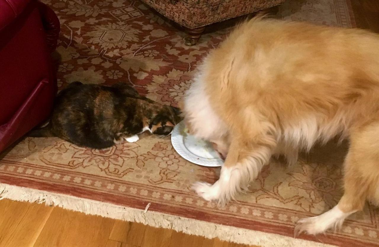 i have two cats as well, and the older one bonded with Callie as a kitten. The other night I came home, and in my headlights in the driveway, I see the two of them walking together with the cat nudging Callie away from the hedgerow and back into the center of the path she was on. Good pets are good friends.