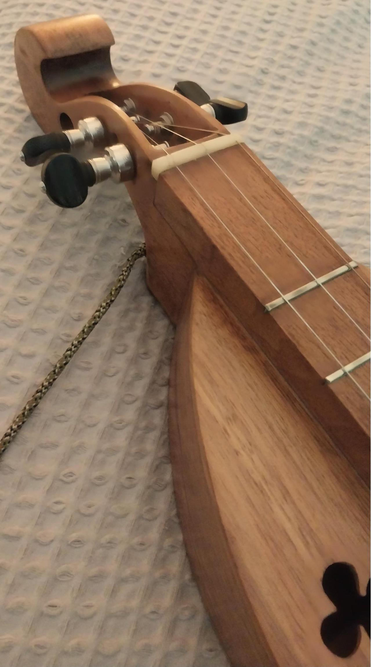 After much research and discussion, I got on a zoom with Joe Collins at New Harmony Dulcimers and expected that I would be waiting 3 months for a new dulcimer as they build to spec, usually. But they showed me this one just as an example of what the short scale Pudge Pro (24”) looked like and the second I clapped eyes on it I knew it needed to come live with me. It was originally set up to be a baritone but they just changed the strings for me to be a standard DAd tuning. The back and sides are Peruvian walnut and the top is swamp ash and it’s just gorgeous. And I can make chords with it far better than with the Berg. My goal is to have a couple of songs ready to go on stage next summer at Ferry Beach, right now I’m mostly working the basics of scales and chord shapes and stuff like that. Y’all might get a video in the new year!