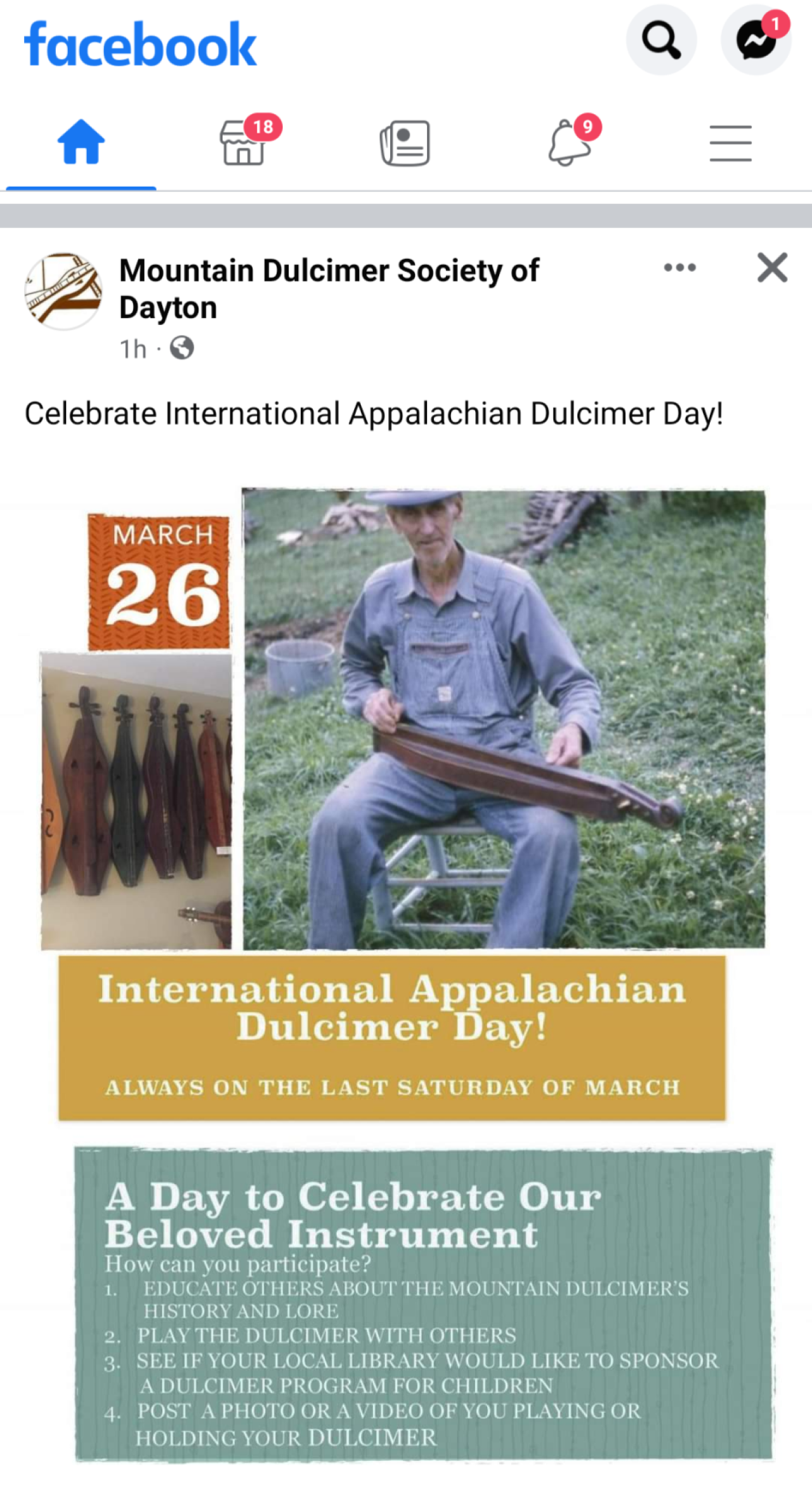EDIT: I just looked at that International Mountain Dulcimer Players Day group on FB again. It seems members were not posting their own music to celebrate the day but sharing the music of others. At least that's what it looked like may have been the focus.
