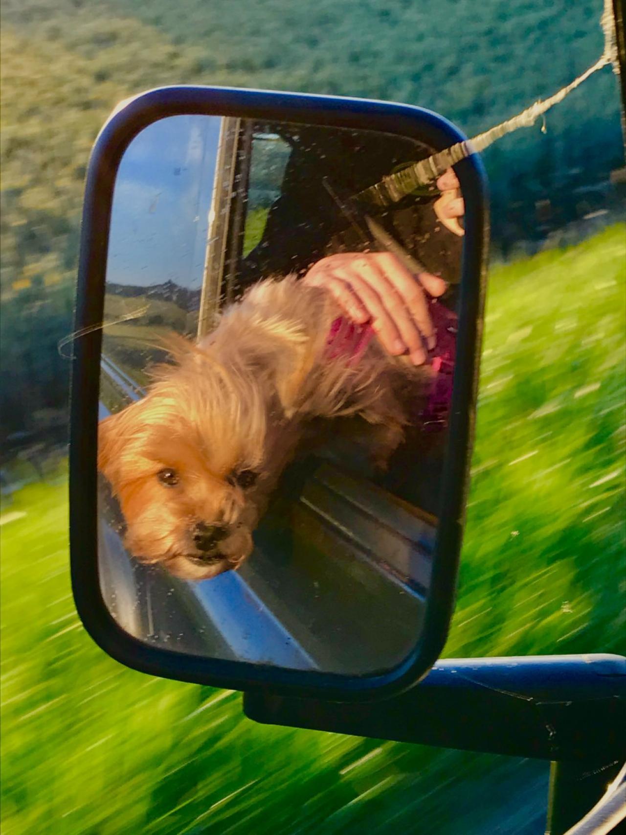 I love our truck's rear window over the truck bed, but learned to put a stick in the track so it only opens big enough to put his head out. Nothing like being on the interstate & looking in your rearview mirror & your dog is past his chest trying to get out!!!