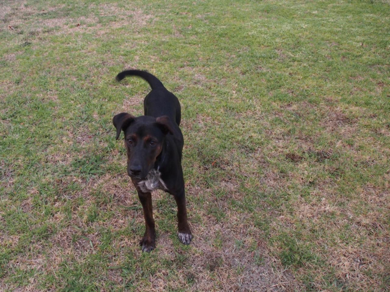 She is probably a German Shorthaired Pointer cross, with either a whippet and/or a kelpie, being mainly black with brindle eyebrows, brindle legs and ears and Pointer white with black spots on three feet and her chest. She loves other dogs, and also loves cats - my two don't quite know what to make of her, and are very curious. She won't make full Pointer size, which is fine with me!