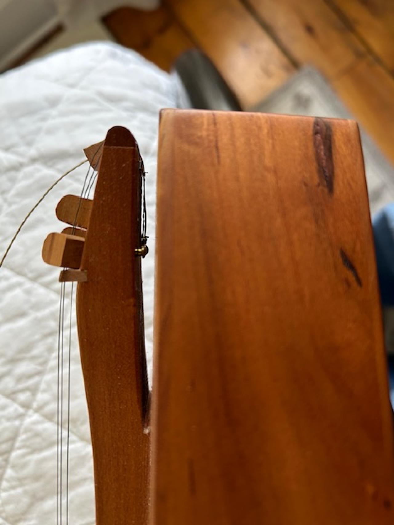 Hello all. I’ve joined this site hoping to get advice. I’ve been given a Keith Young dulcimer. I’d love to learn to play it, but it needs new strings and I cannot figure out how to restring it. The little pegs that hold the string loops are on the underside of a very narrow space on the under side of the end of the fret board. And the existing strings have been wound so tight that they won’t simply slip off. I’ve attached a photo. Advice appreciated.