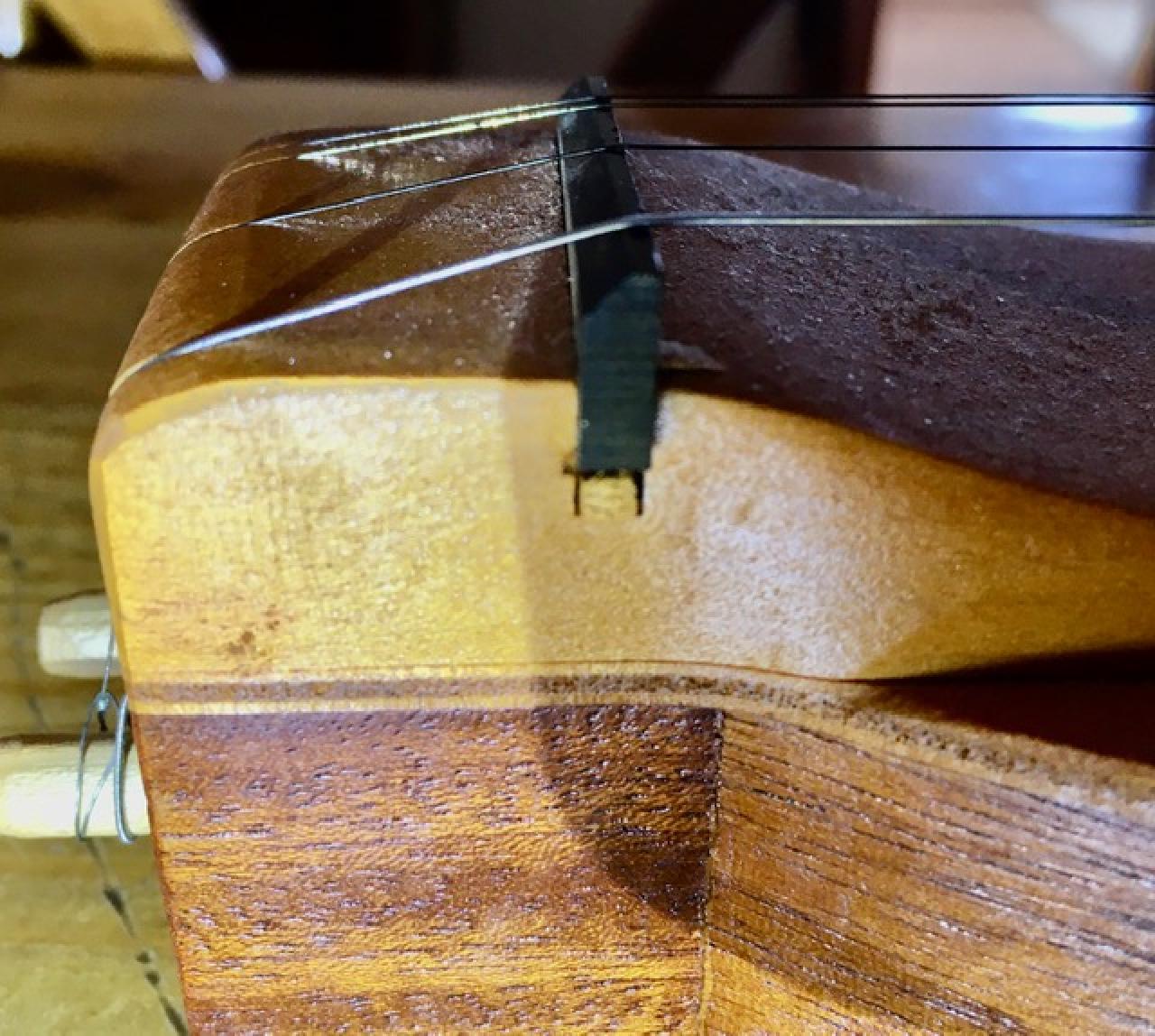 1. The bridge is 'canted' with what appears to be a small peg under the D string. Does anyone know if this is factory or an adjustment someone made?