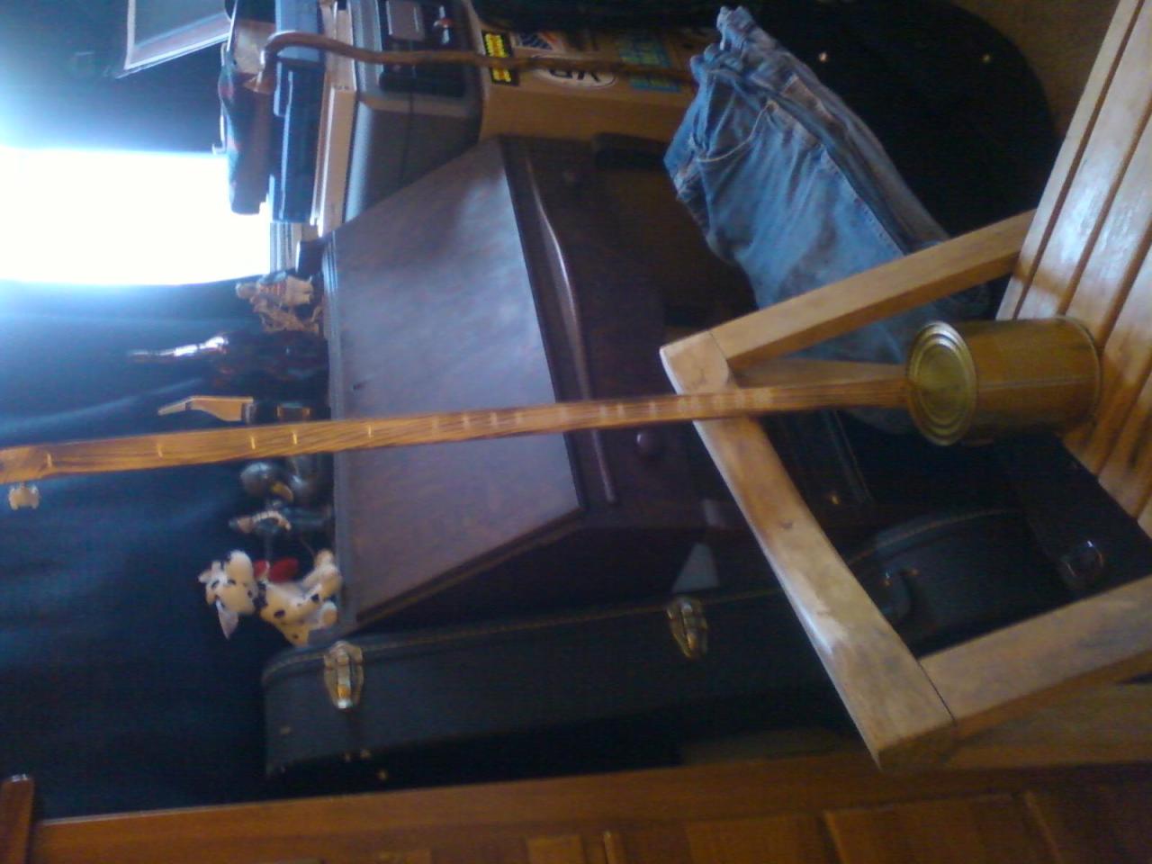 Not sure if this qualifies as a mtn dulcimer, but here's an instrument of innovative hillbilly engineering I picked up this weekend. The guy who makes these calls it a "can-jo". The neck is fretted like a dulcimer with ONE string. Staples for frets and an empty soup can for a body/soundbox. 20 bucks. It came from a place in Canastota, NY called Yankee Doodles. He makes mtn dulcimers as well.